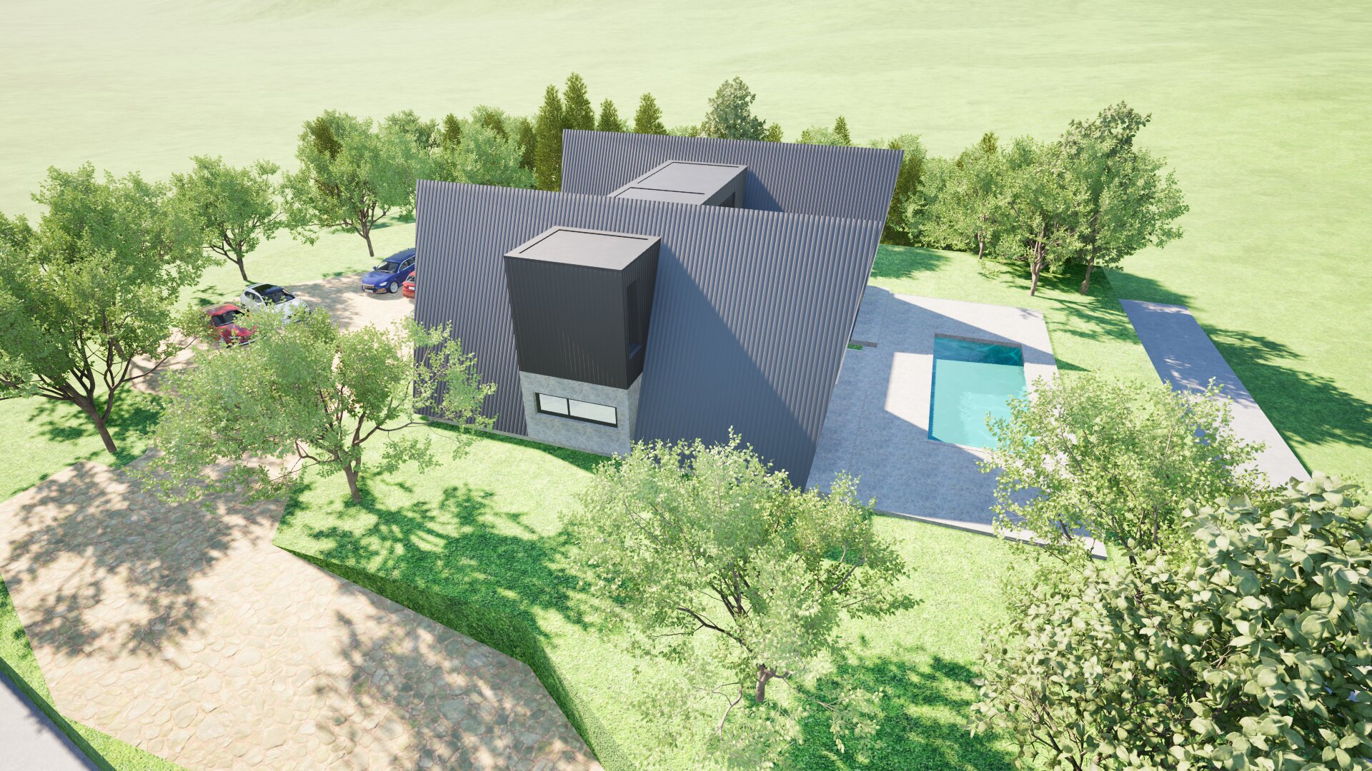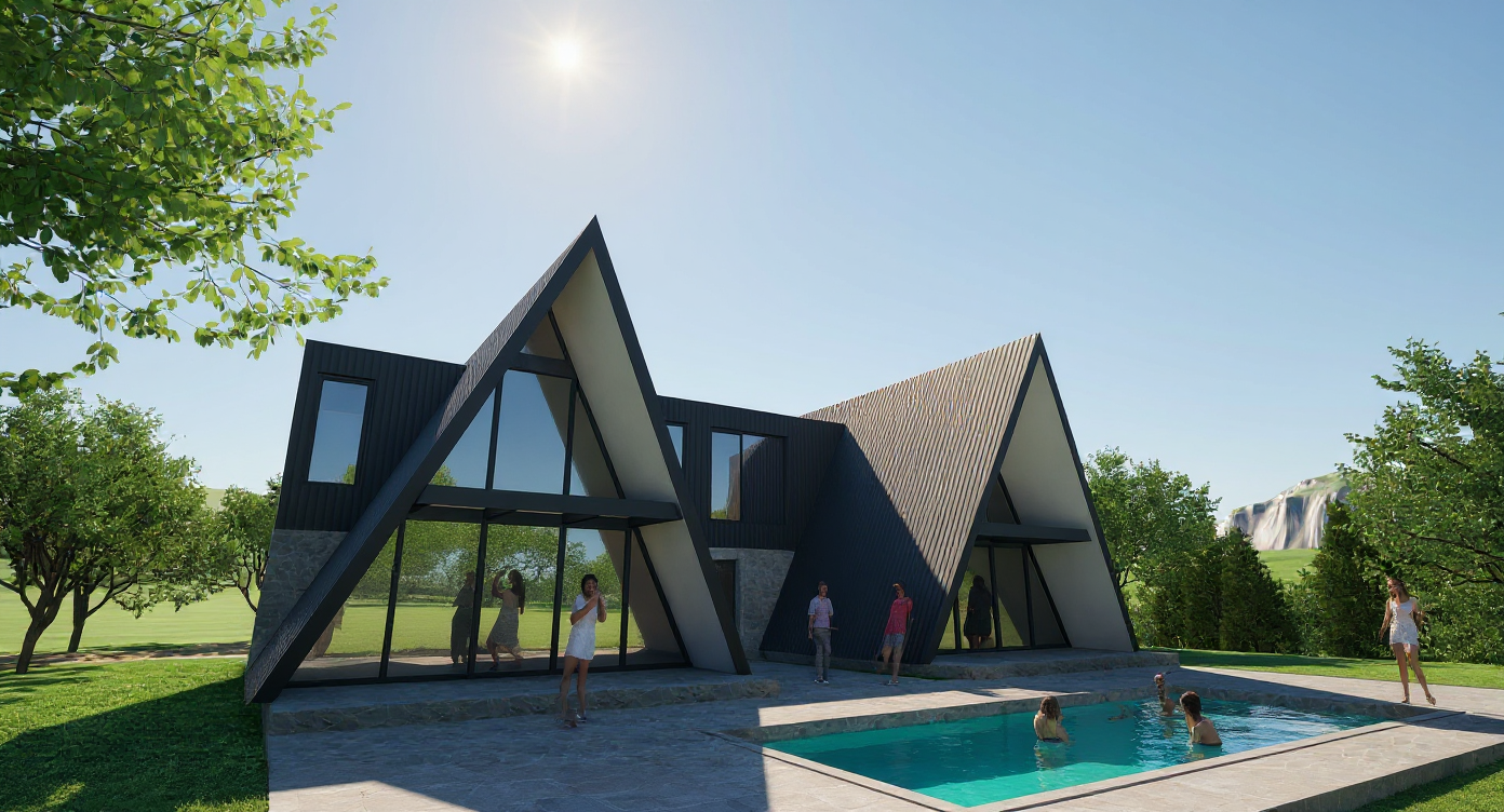 make render more realistic add people party on pool glass is not reflective make sharp edges of grass smother than in 3d