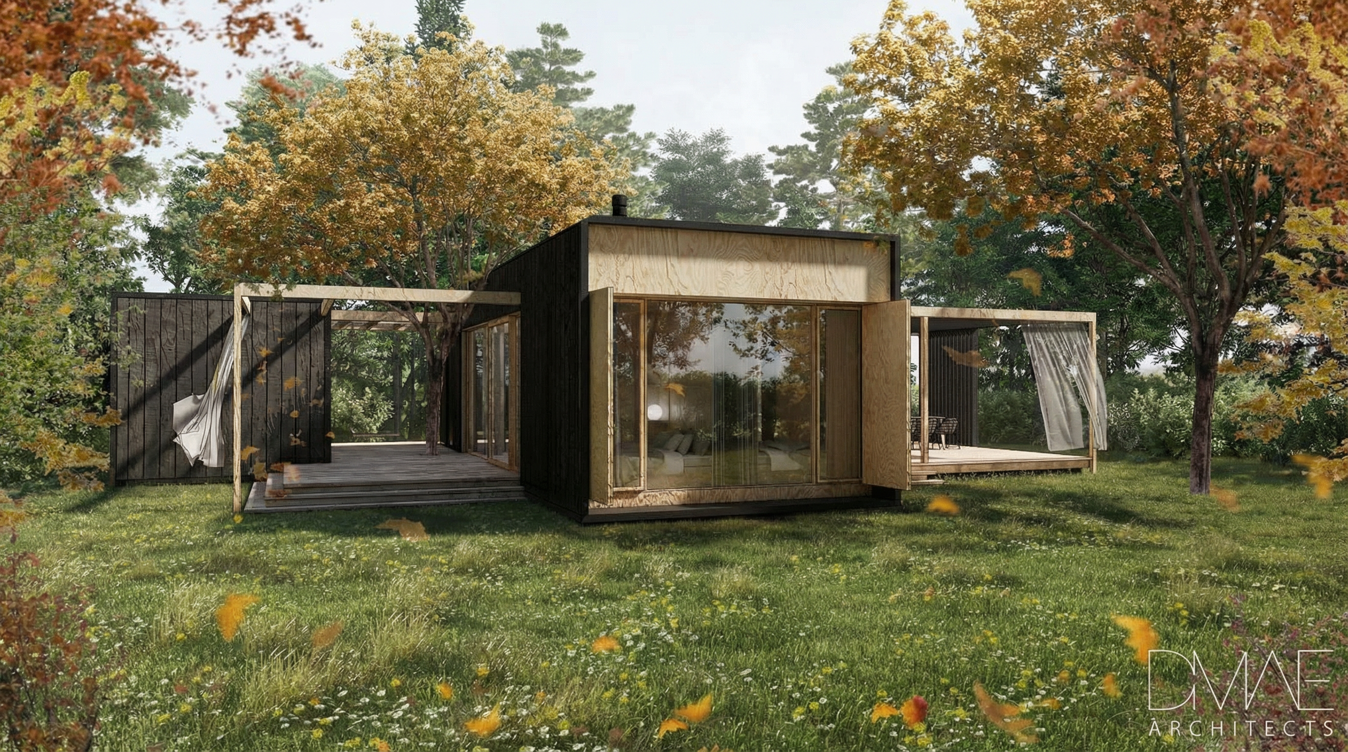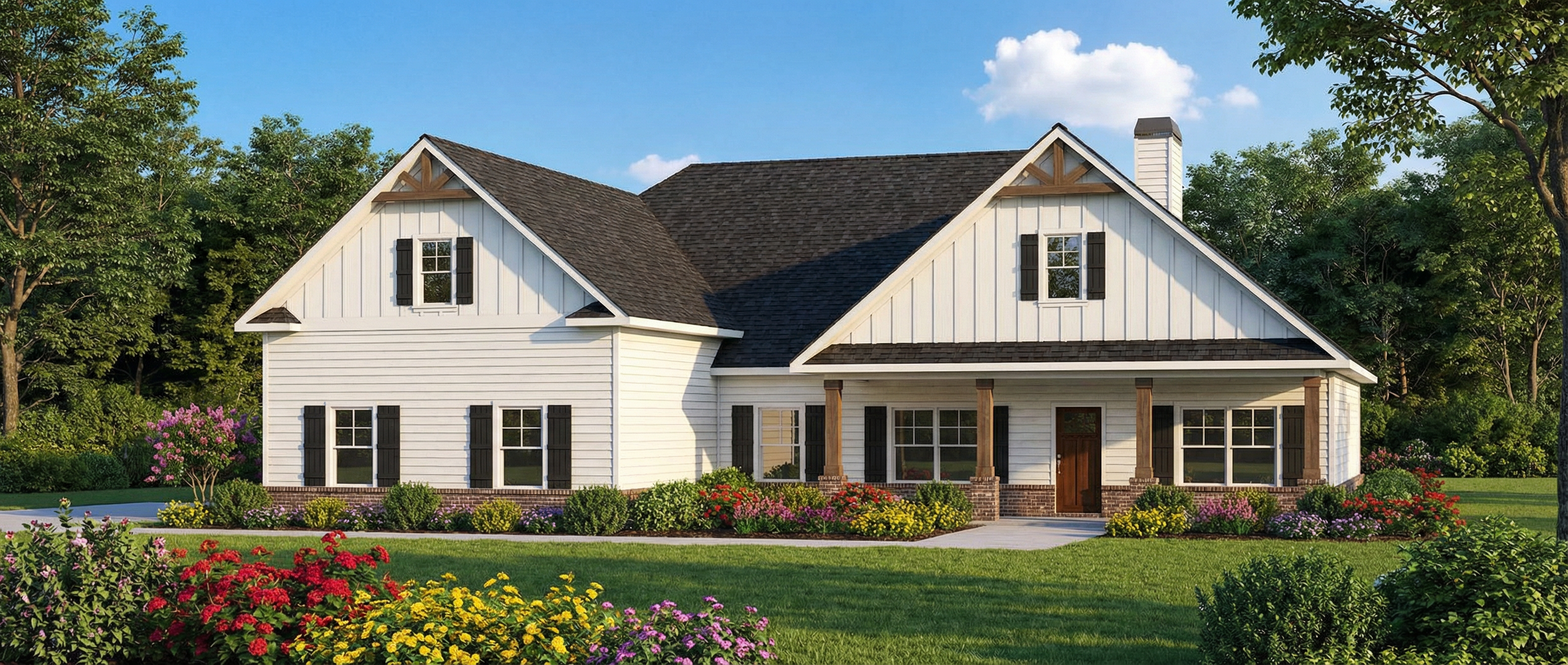 redy brown plain roof tiles black cladding where shown brick elsewhere to walls show some sky and trees in the background