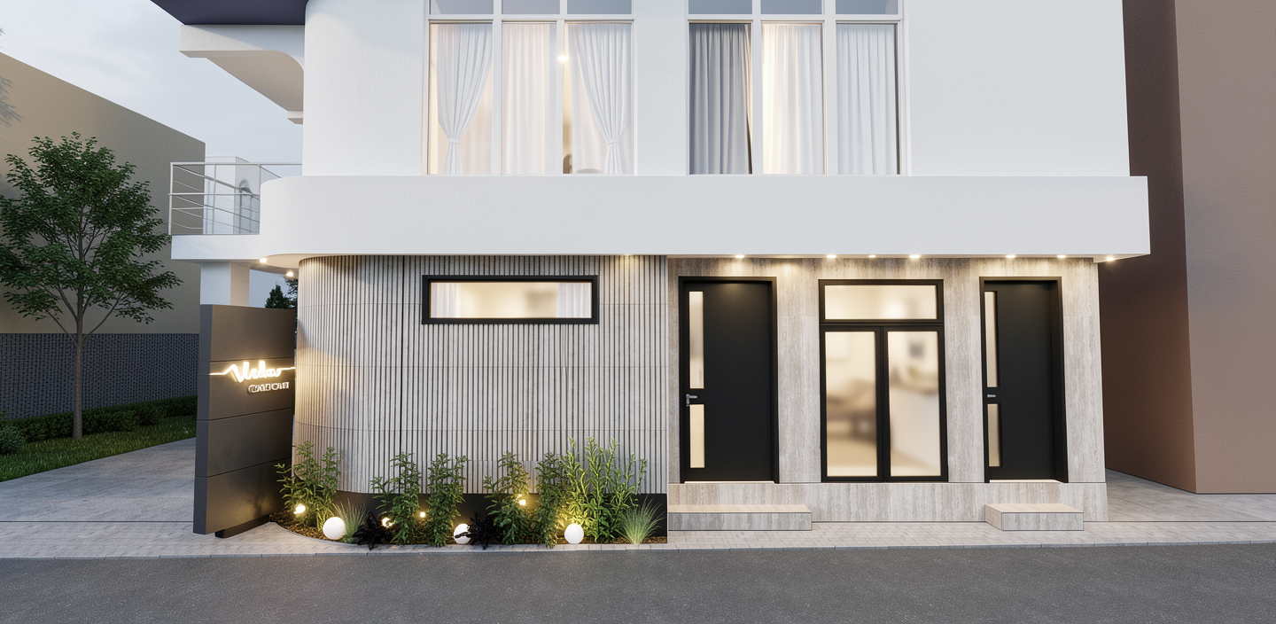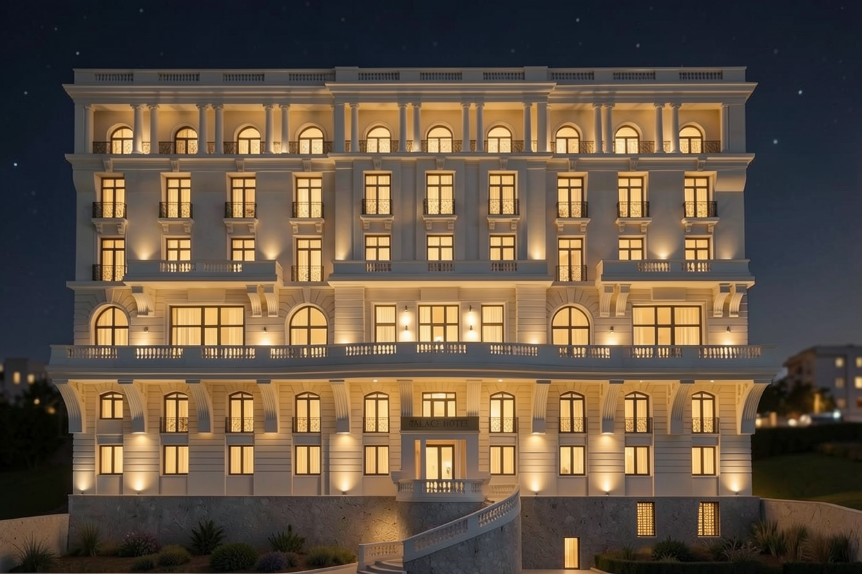 convert this daytime architectural elevation into a luxurious night scene preserve all architecture exactly in both foreground and background remove all furniture and terrace plants use minimal restrained vegetation appropriate for romania no palms under any circumstances or none at all emphasizing a clean mineral foreground keep the background unchanged but softly out of focus enhance the signage so that the text palace hotel is elegant clearly visible and harmoniously integrated into the fa ade use a muted sophisticated color palette of ivory beige and gold emphasize realistic cinematic lighting with warm interior glows subtle exterior accents and gentle reflections ensure the scene is elegant immersive and luxurious without altering the building s structure perspective or materials