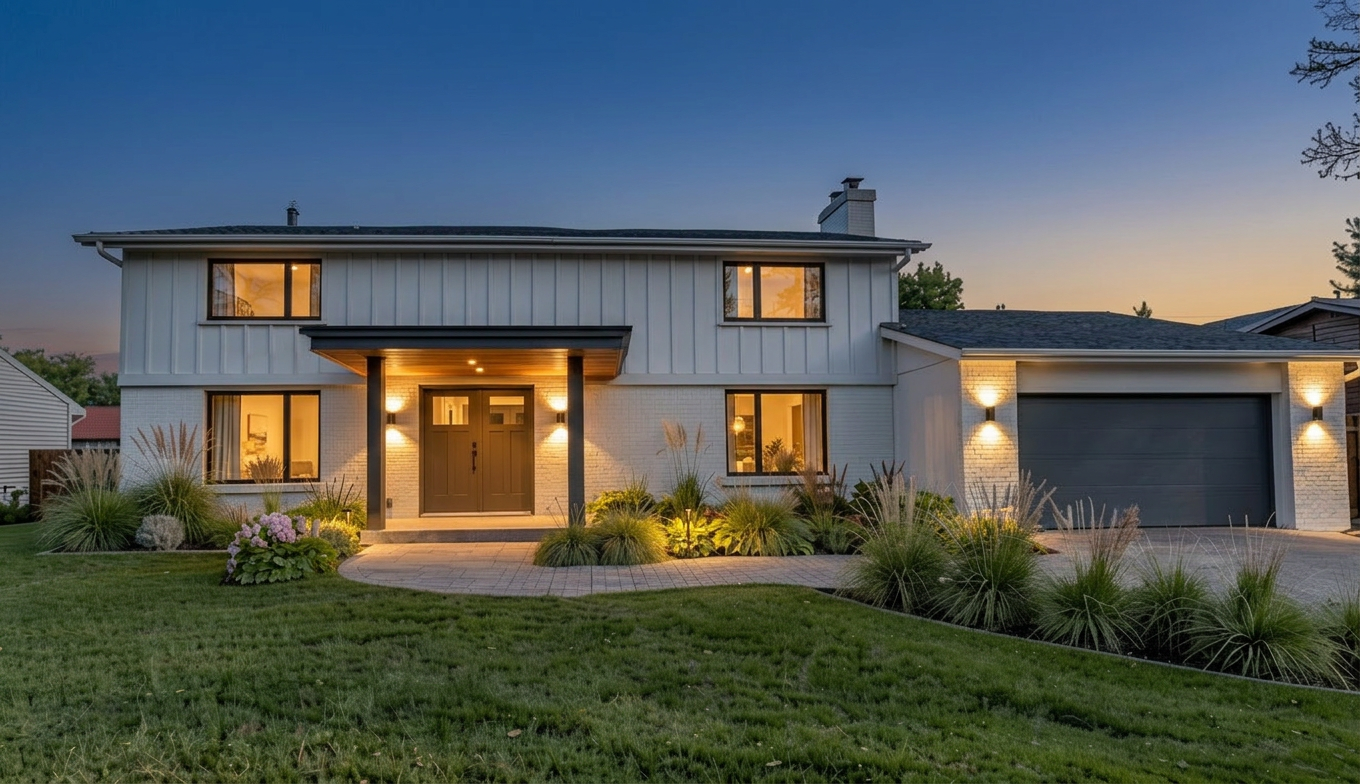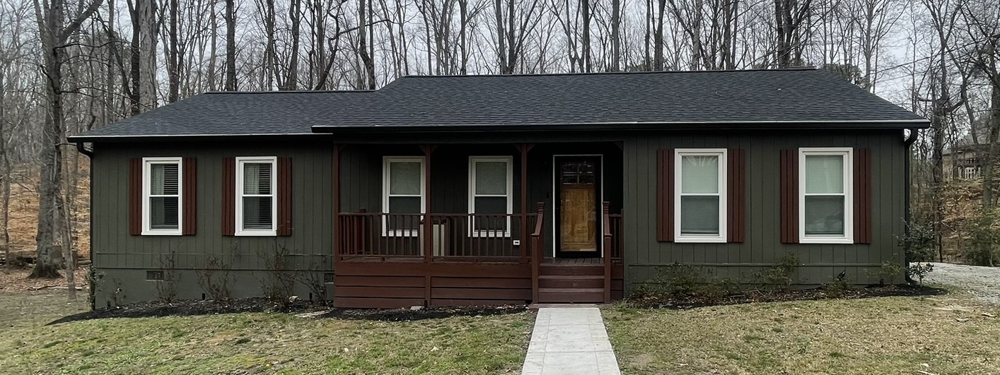 add a gable roof with open truses patio with white rocks at the bottom half of the house