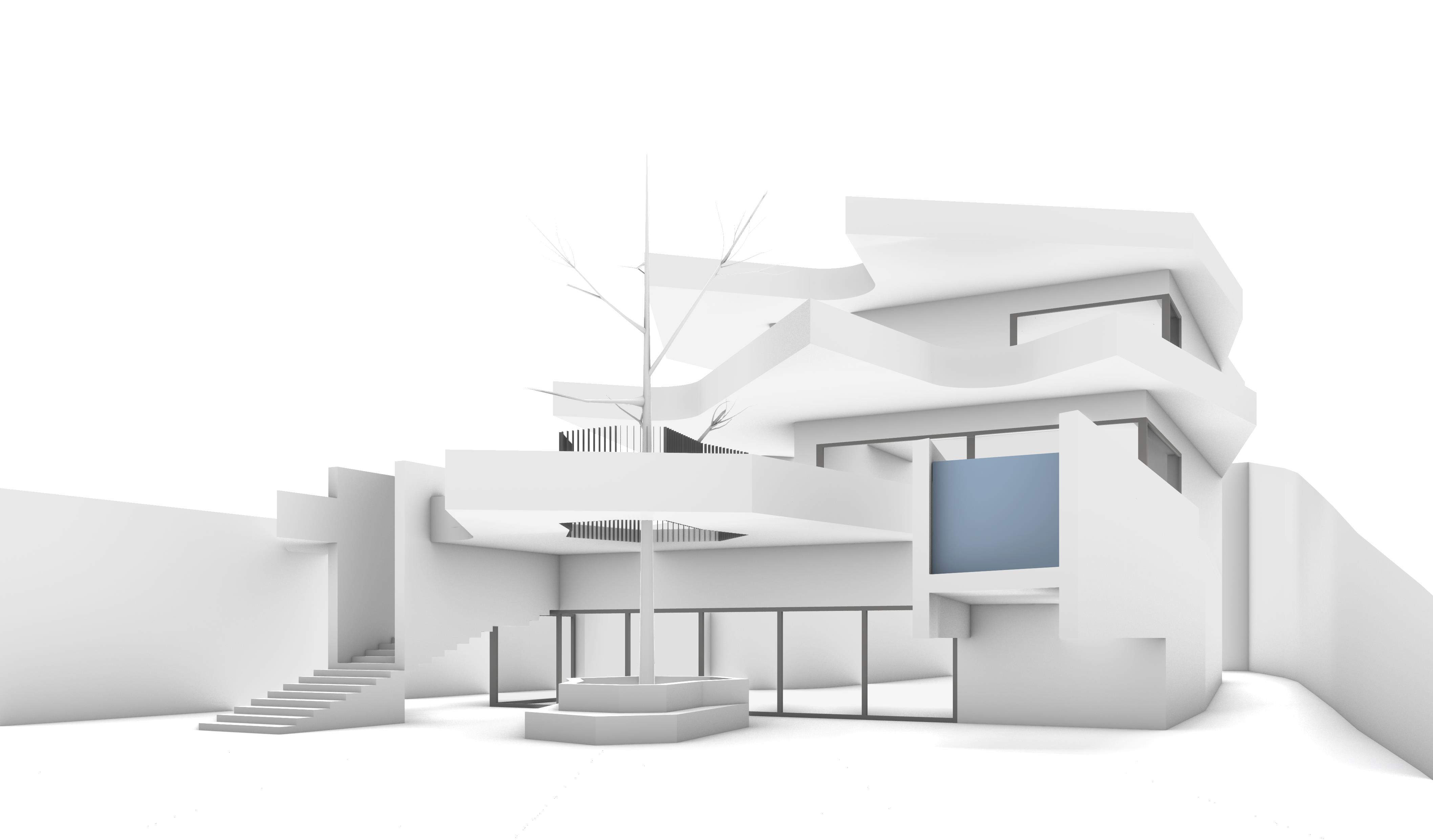add concrete texture on the building add some leaves on top of the tree but dont make the tree big add very small cobblestone texture on the ground add a black car in the ground floor behind the glass make it look realistic