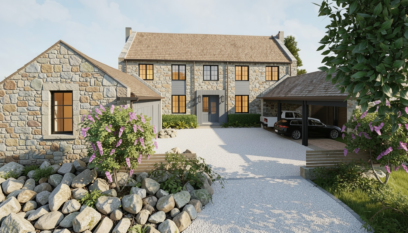 stone area random rubble imestone with heavy lime mortar schemer stone to mortar area between upper and lower windows to be grey shiplap area around front door to be grey shiplap windows to be black frame with warm glow roof cedar shakes with heavy shadow line don t change architecture gravel driveway