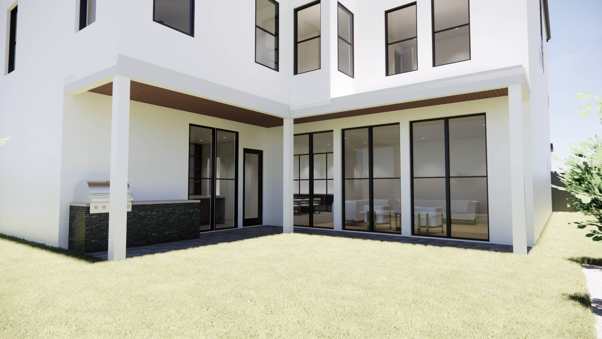 convert this architectural rendering into a highly realistic editorial style luxury outdoor photograph suitable for marketing and listing imagery maintain the exact architecture layout geometry porch structure ceiling design openings and proportions exactly as modeled do not redesign restyle or modify the architecture in any way do not move walls columns windows doors or built in elements enhance realism only through natural lighting accurate material texture subtle reflections and soft shadow depth the final result should feel like a professionally photographed architectural digest style exterior used for luxury real estate marketing materials in the space include tilebar 12x24 black slate tile flooring in a offset pattern smooth stucco sherwin williams pure white roof standing seam charcoal metal with no slope flat roof soffits and fascia painted sherwin williams origami white gutters and downspouts in charcoal finish fluted wood ceiling cladding the black slate tile should appear natural matte and slightly textured with subtle tonal variation and realistic grout lines the herringbone pattern should read clearly with correct scale and alignment the roof shingles should appear textured and dimensional with natural variation consistent with charcoal architectural shingles the soffits and fascia in origami white should appear soft and clean with subtle tonal depth the gutters and downspouts should appear matte charcoal with realistic metal finish and clean edges the fluted wood ceiling should show realistic wood grain depth and shadow between flutes with a warm natural tone do not add or modify any furniture if furniture is present keep it minimal and secondary to the architecture without adding new elements the outdoor space should feel elevated calm and refined with a strong connection between the porch and yard lighting should include soft natural daylight with gentle exterior shadows and realistic light falloff the lighting should feel balanced and editorial not harsh or overly dramatic the final image should appear crisp photorealistic and editorial similar to a professionally photographed luxury exterior avoid warped or exaggerated wide angle distortion the perspective should feel natural as if captured by a professional architectural photographer with straight vertical lines and balanced proportions do not alter architecture layout geometry or materials only enhance realism the yard is mostly grass the only part with the slate look floor tile is under the porch itself