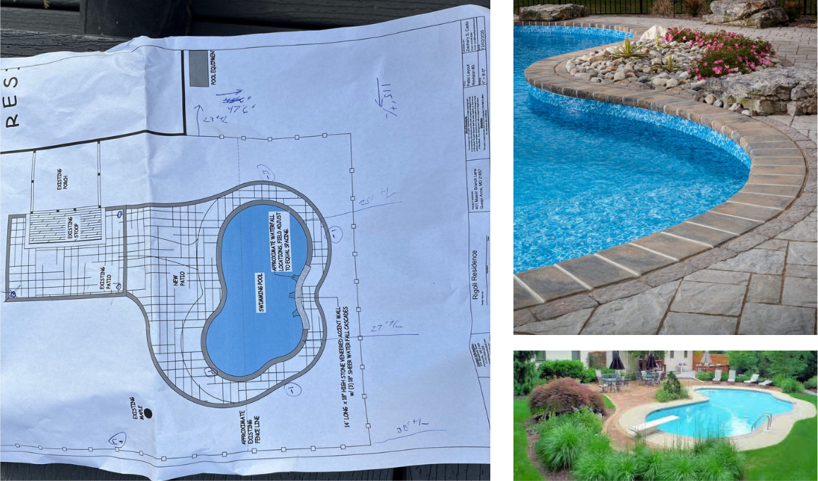 exterior shot using the image and the lines on the ground apply the pool design in the mood board and the the other images for style