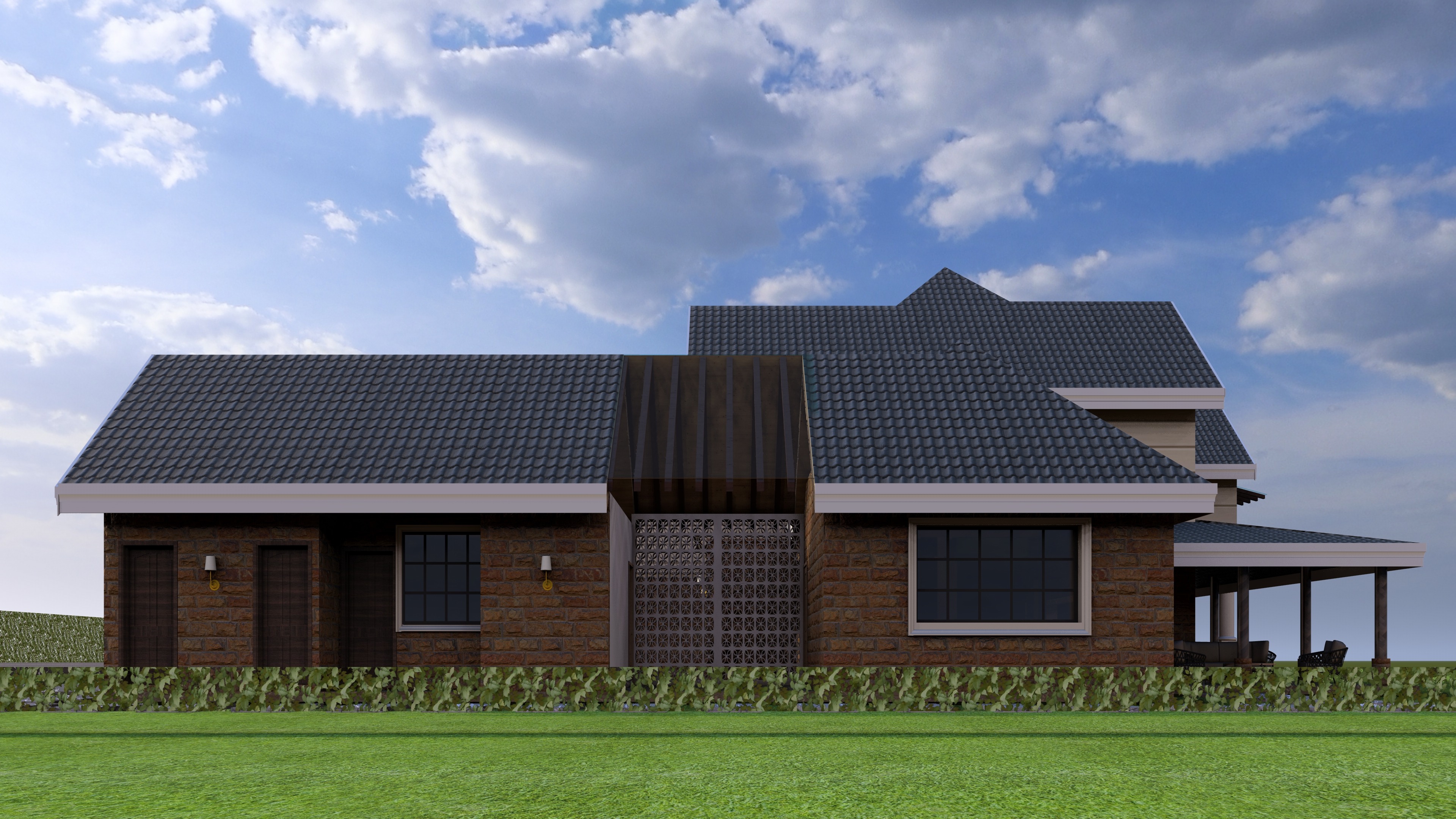 this is a model of a house add some few trees in background and neat vegetation to give it context