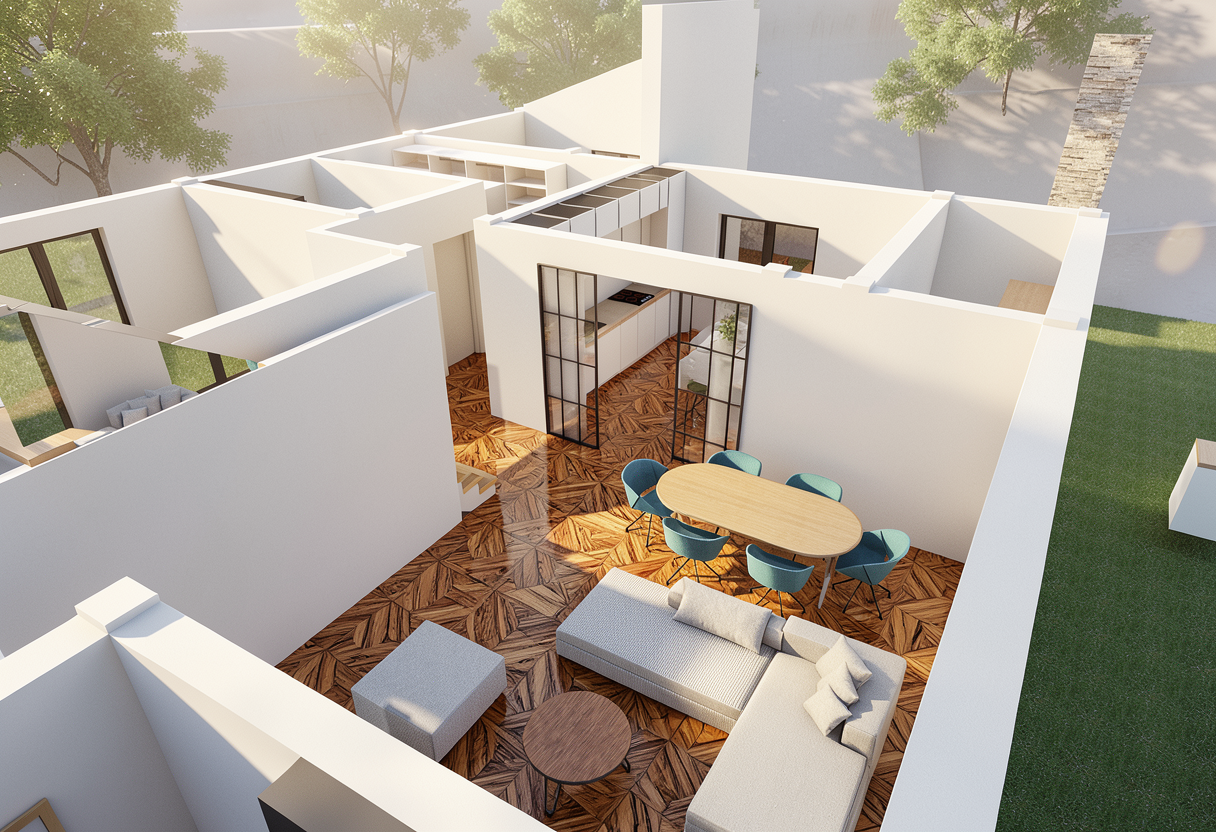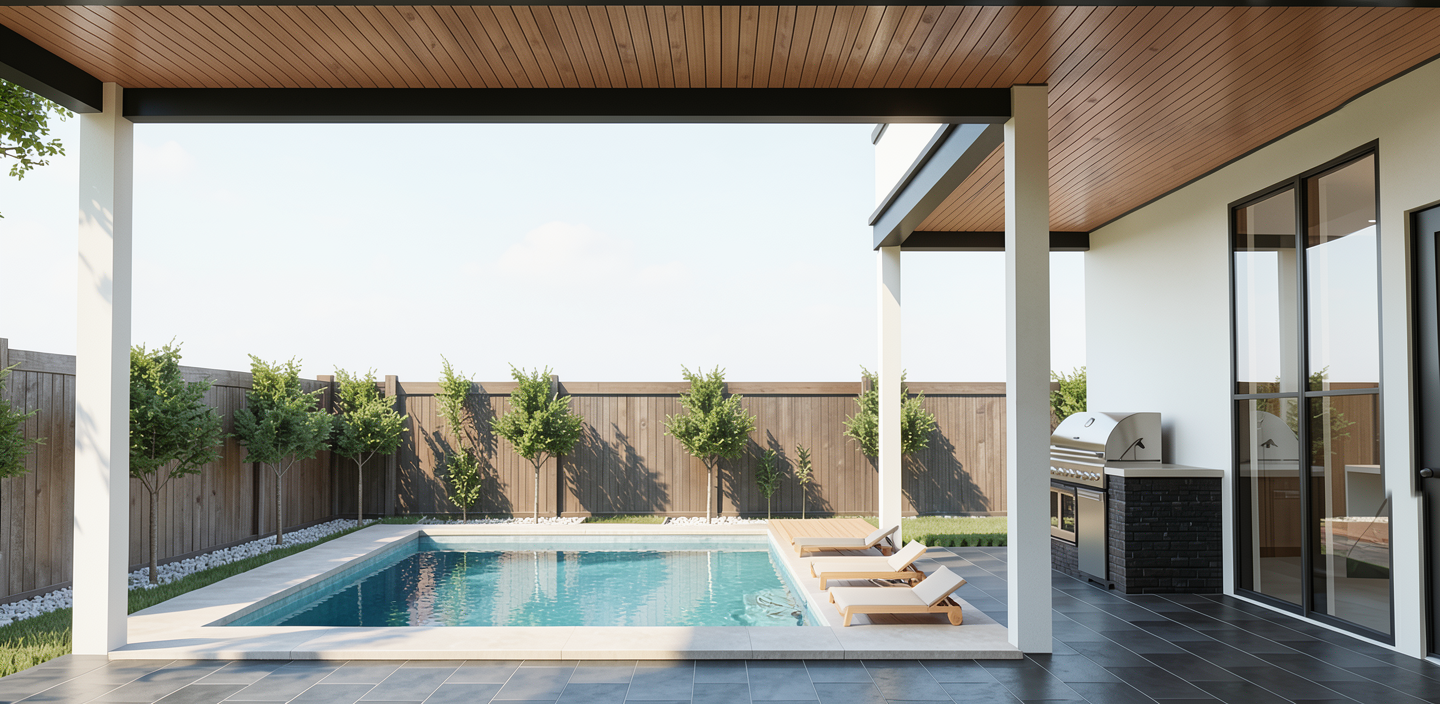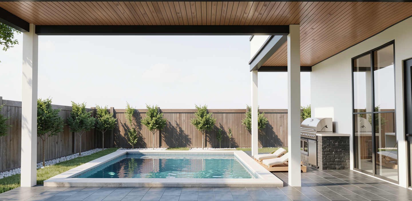 update this image by adding a very small integrated rectangular cocktail style pool maintain the exact architecture layout geometry landscaping materials grading and all existing elements exactly as shown do not modify or move the house porch or planting layout the pool should be compact and understated in scale clearly a small cocktail pool integrated directly with the existing patio deck not floating in the yard positioned so it feels like a natural extension of the outdoor living space include a tanning deck sun shelf within the pool at one end sized proportionally to the small pool add built in in water tanning loungers on the sun shelf only similar to the reference image appearing minimal and clean in design light neutral in color partially submerged in shallow water do not add any furniture outside of the pool itself use light natural materials light neutral interior pool finish with subtle variation clean minimal coping that aligns with the existing deck material flush transitions between pool edge and surrounding surfaces the pool should feel intentional but secondary not the focal point it should read as an optional upgrade that fits comfortably within the yard water should appear clear calm and highly realistic with soft reflections and natural light movement do not add additional hardscape landscaping or accessories do not enlarge the yard or change grading the final image should appear clean photorealistic and editorial as if professionally photographed for a luxury real estate listing avoid distortion the pool should feel properly scaled restrained and seamlessly integrated with the rest of the image remaining unchanged the pool should flow seamless with the porch the tanning deck should be on the back side towards the fence
