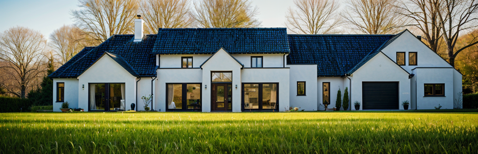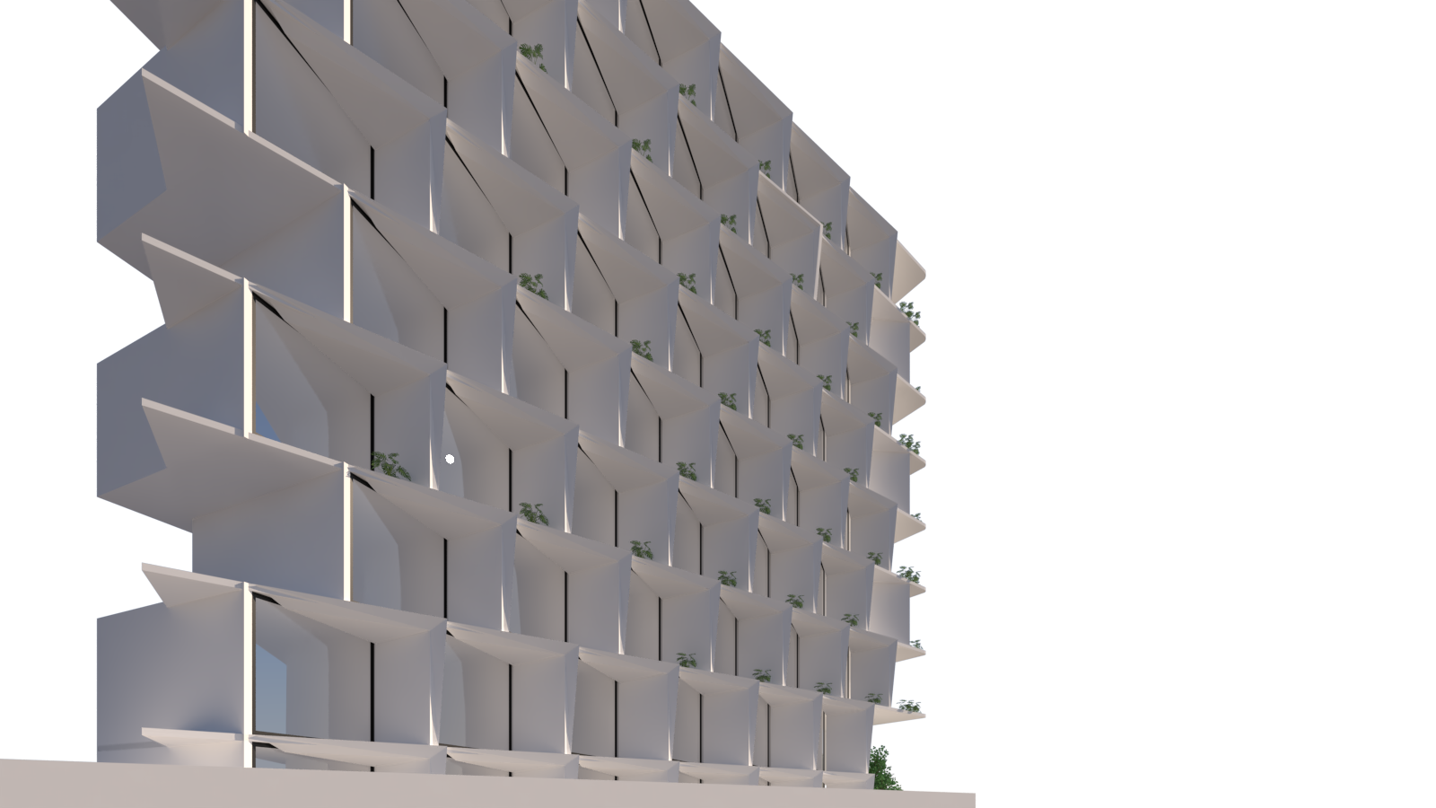 an ultra modern architectural facade with a grid of geometric white panels featuring small green plants nestled in between the structure stands tall against a gradient sky transitioning from soft blue to warm orange suggesting a serene dawn atmosphere the sharp lines and shadows emphasize the building s sleek design creating a harmonious blend of nature and urban elegance