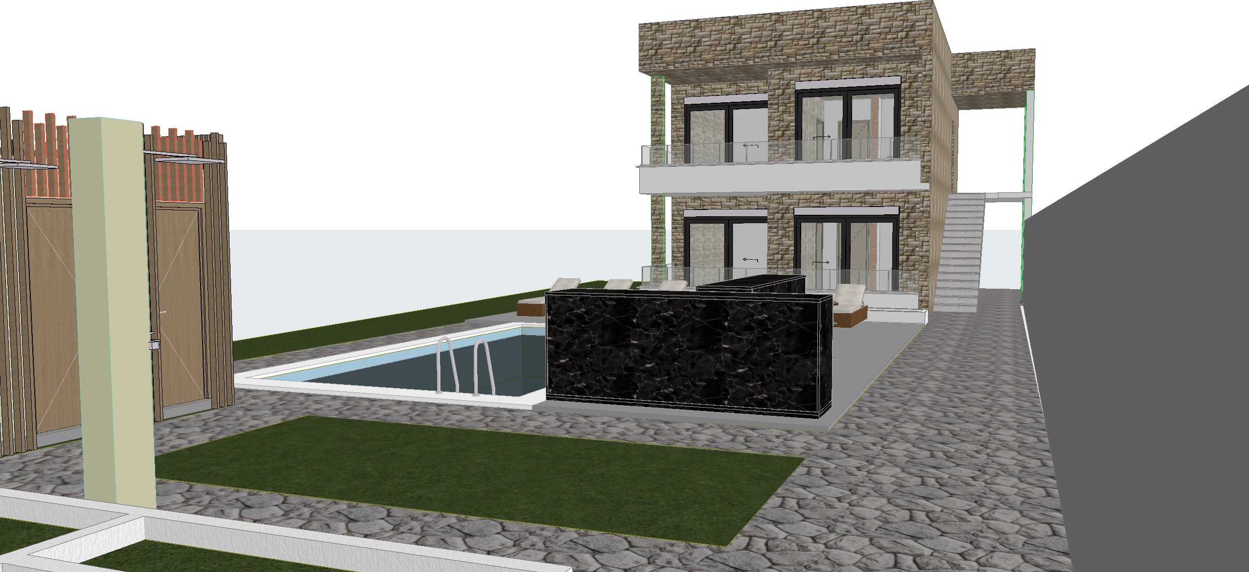 create a highly realistic architectural render of the existing space keep the original design layout materials and structure exactly the same do not change anything add subtle mediterranean greenery olive tree in a large planter small decorative plants and soft natural vegetation warm mediterranean atmosphere natural sunlight realistic shadows photorealistic materials high detail 4k quality realistic textures professional architectural visualization