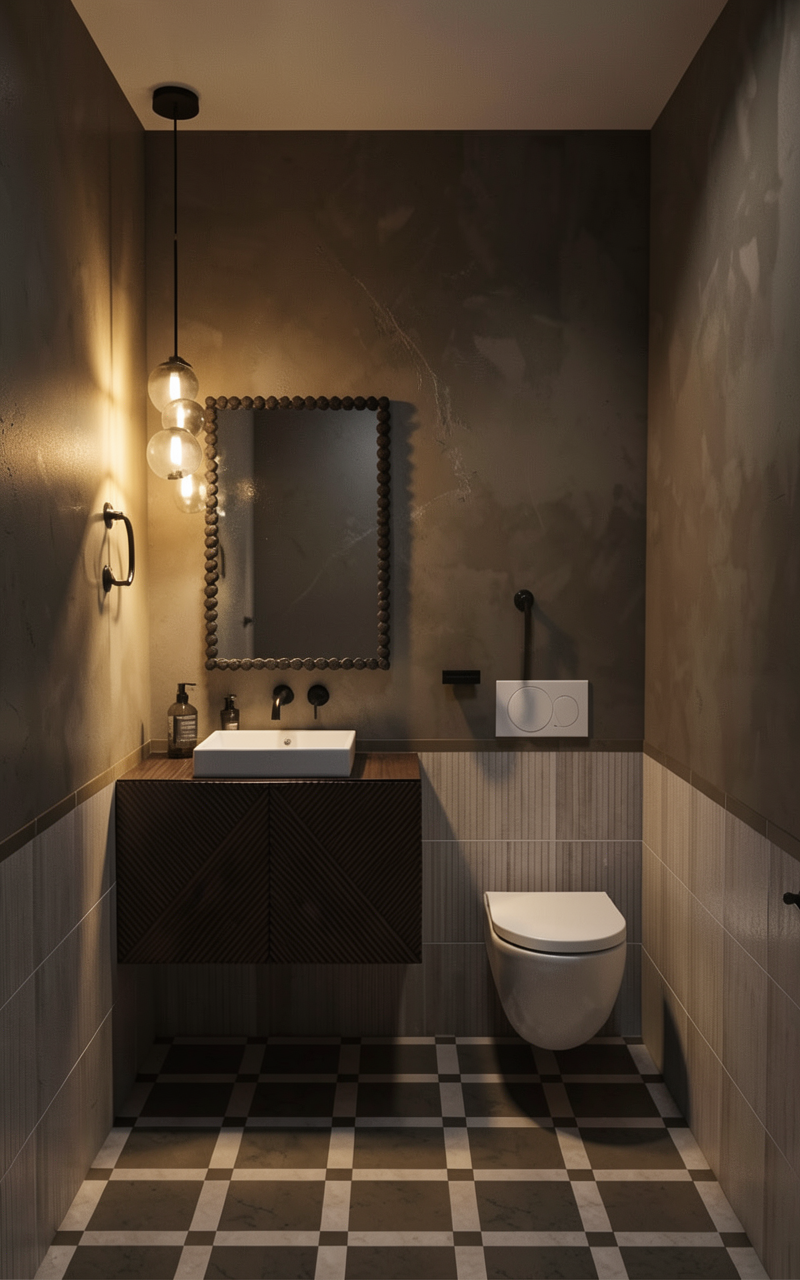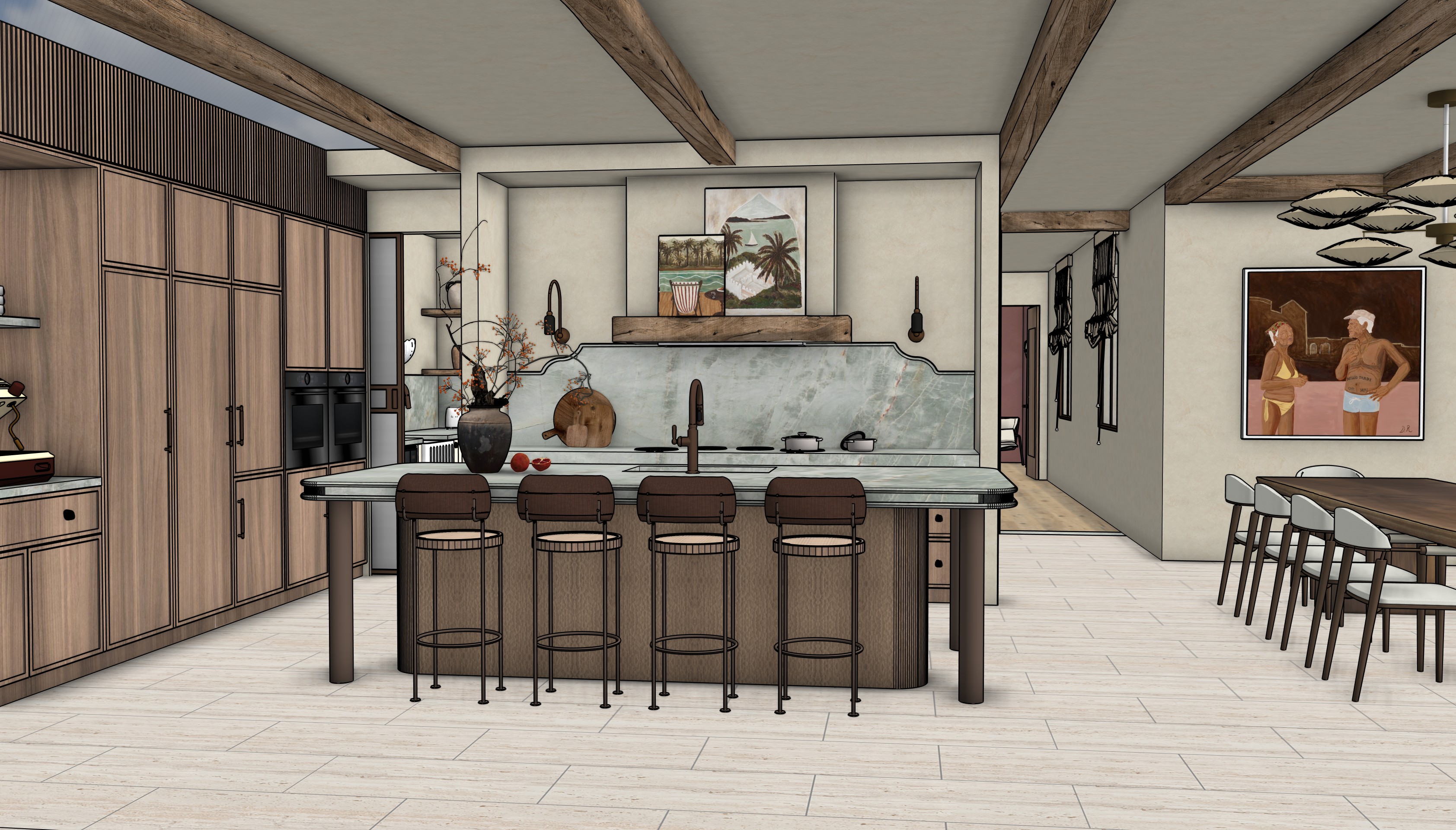 the cabietry timber is a soft mid tone not dark the kitchen island legs are a bronze the green the benchtops splashback stone is a soft light emerald quartzite walls ensure kitchen island stone benchtop edges are all quartzite and ceiling are a warm off white limewash the front sides of the kitchen island are a hand chiselled timber
