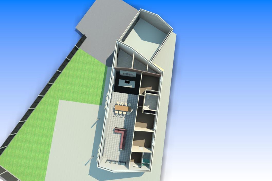 interior from the top make this photorealistic add minimum furniture including beds to the bedrooms add cars in the carage which is the room at the top