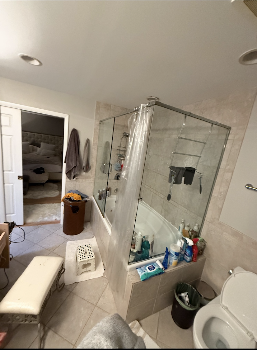 zaha hadid interior shot redesign this bathroom while maintaining the exact existing layout including the window placement toilet location and shower tub combination create a modern elevated bathroom with a warm neutral palette featuring creamy tones soft browns and subtle taupe the design should feel refined clean and timeless with a quiet luxury aesthetic incorporate large format oversized tile on both the floors and walls with minimal grout lines for a seamless spa like look include a 42 inch single sink vanity with an integrated makeup area directly adjacent to it the vanity should feel clean lined and custom in a warm wood or soft neutral finish use a warm creamy stone countertop as a focal point add a backlit led mirror above the vanity paired with soft elegant lighting such as wall sconces in a brushed gold finish update the shower tub combination with the same large format tile and a clean modern look include a minimal glass panel or refined enclosure all fixtures should be brushed gold with a warm tone no chrome or cool finishes ensure the lighting is soft and layered with natural daylight coming through the window the overall design should feel realistic buildable and professionally designed not staged or overly decorative prioritize accurate proportions realistic materials and architectural clarity avoid generic or overly styled interiors maintain correct scale and spacing based on the existing room architecture