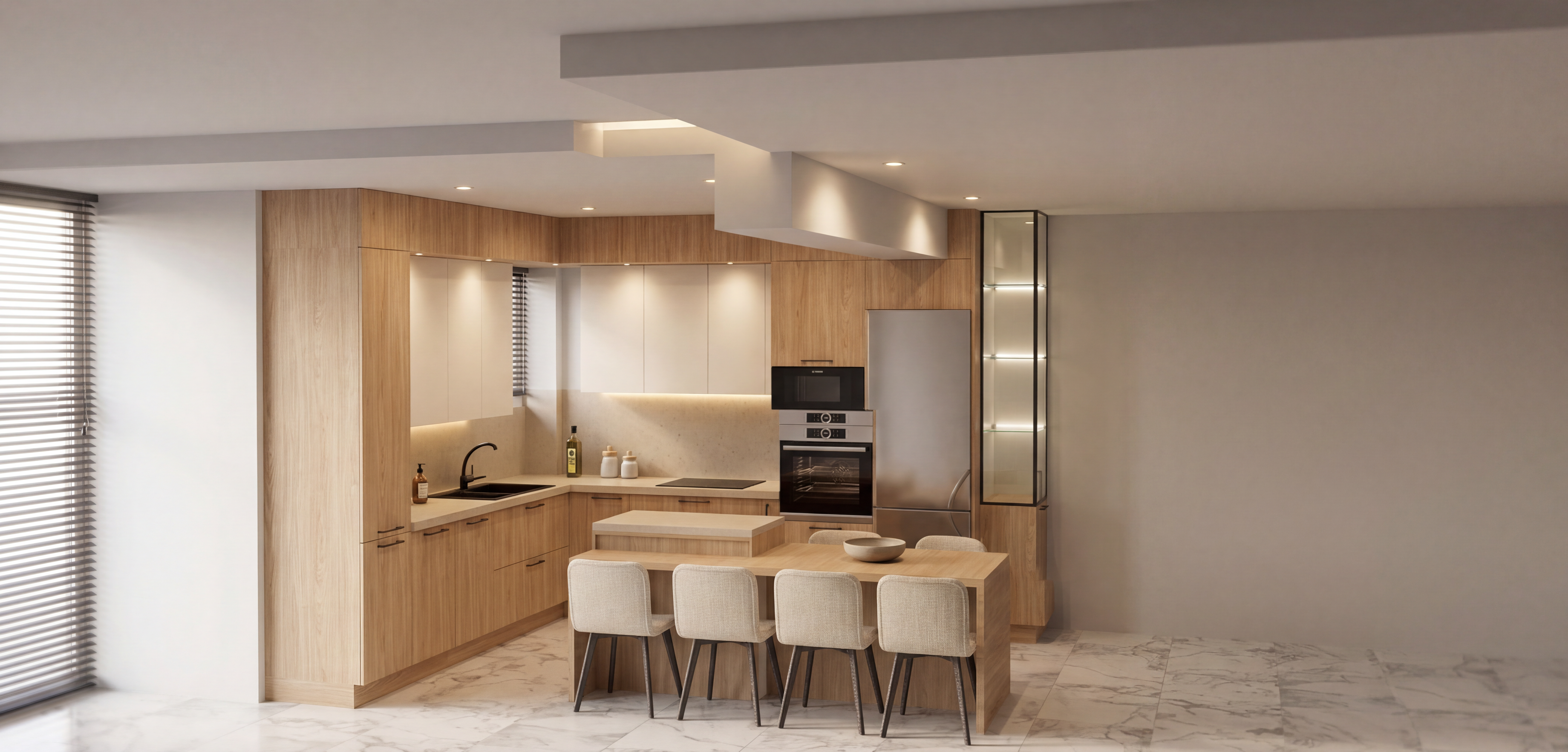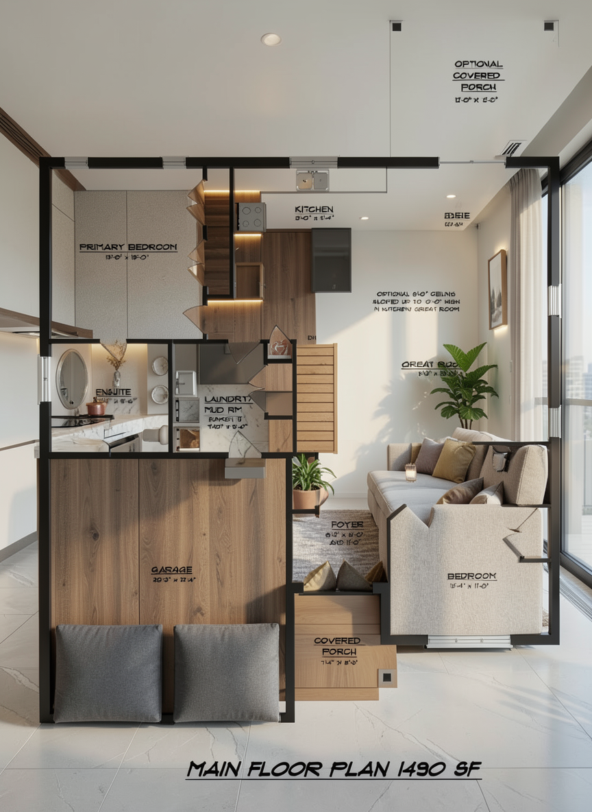 a modern bathroom design white travertine flooring complements a light walnut vanity with full length walnut pulls the fixtures are stainless steel and the faucet is graphite or luxe steel the mirror reflects the smooth flat panel white door