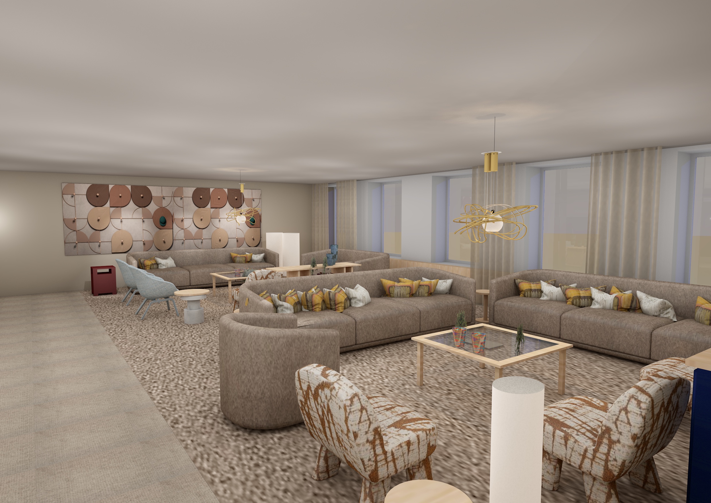 make it more photo realistic add a nice book and some flowers on the coffee tables the view from the windows should be a city view but not like nyc