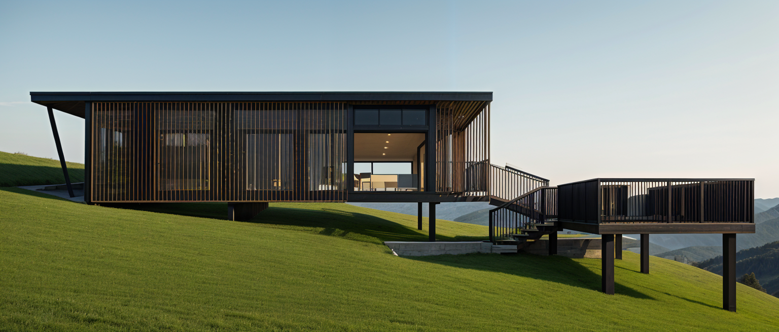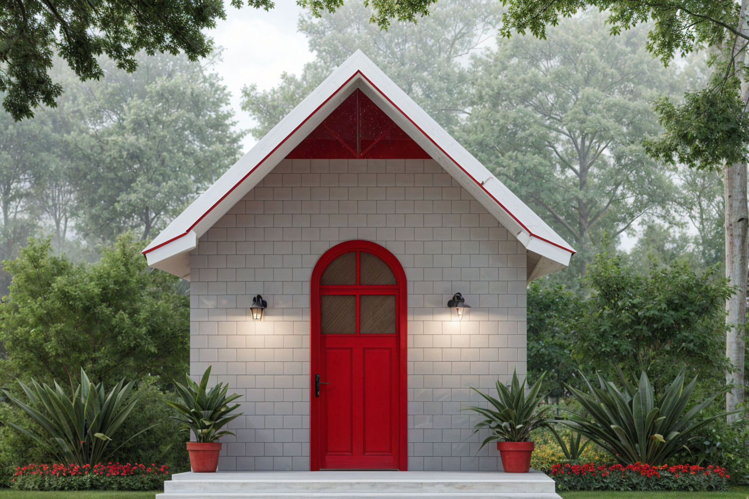 i want to see forest in the back ground only i want the building to include red in it i want a walkway with some plants by it that lead up to the structure i want the style to look more black forest or german with a modern appeal