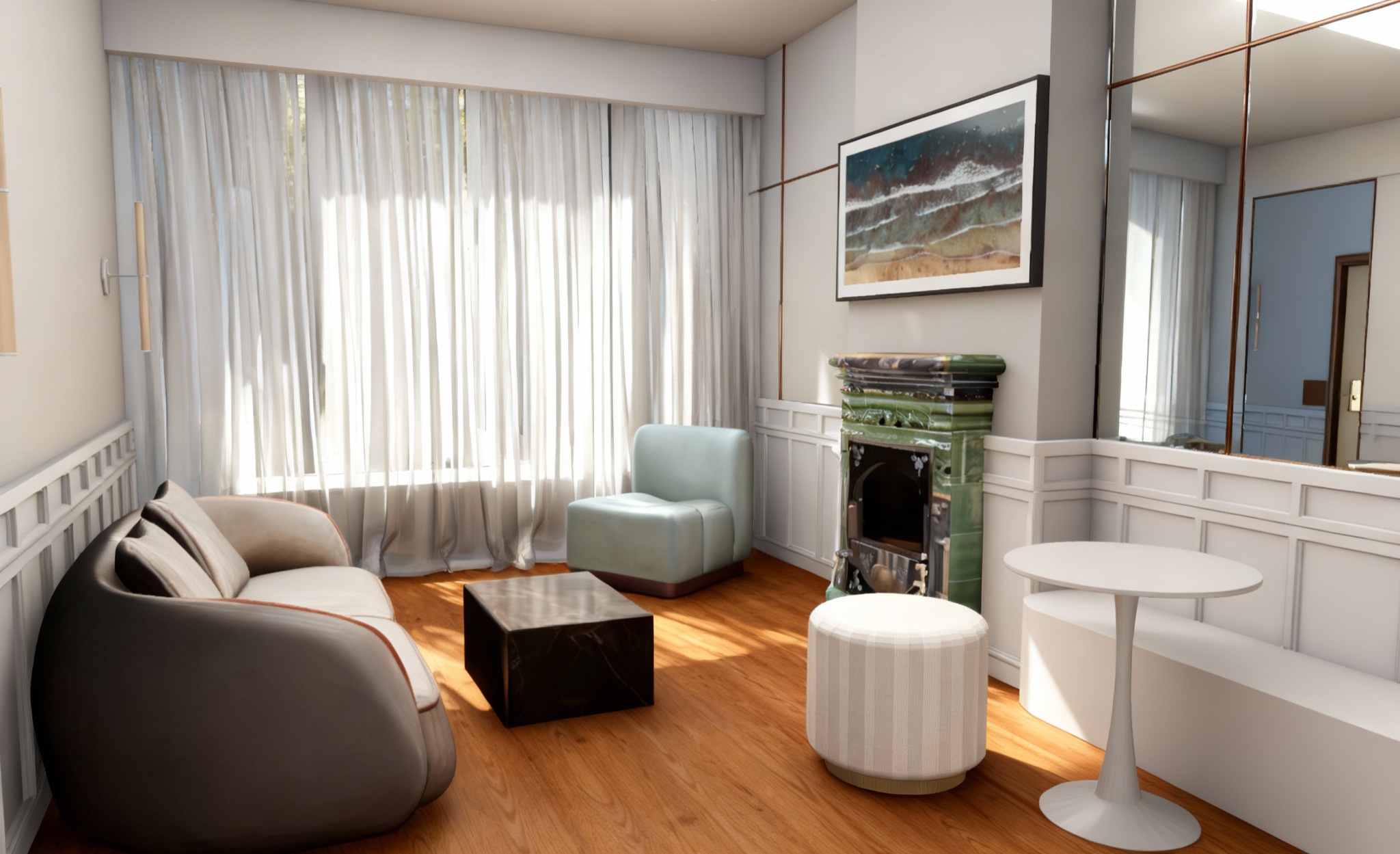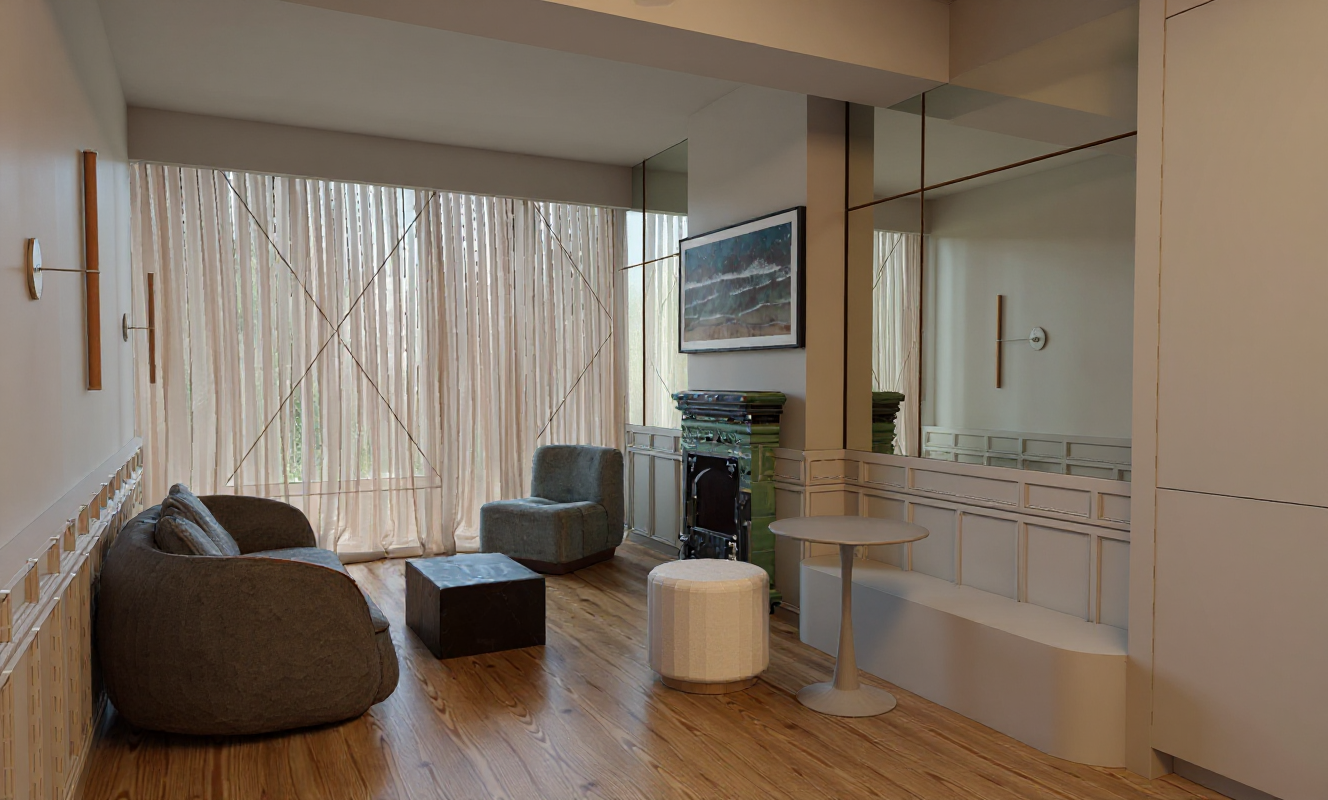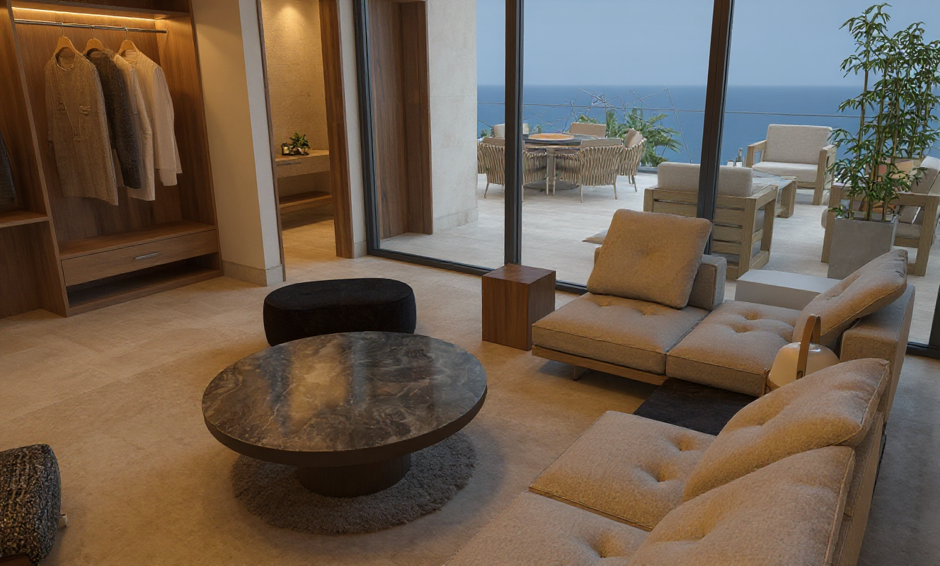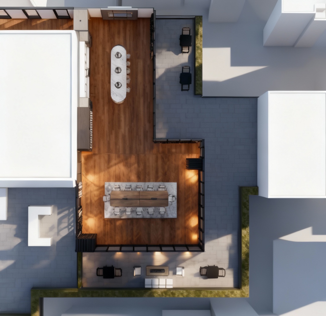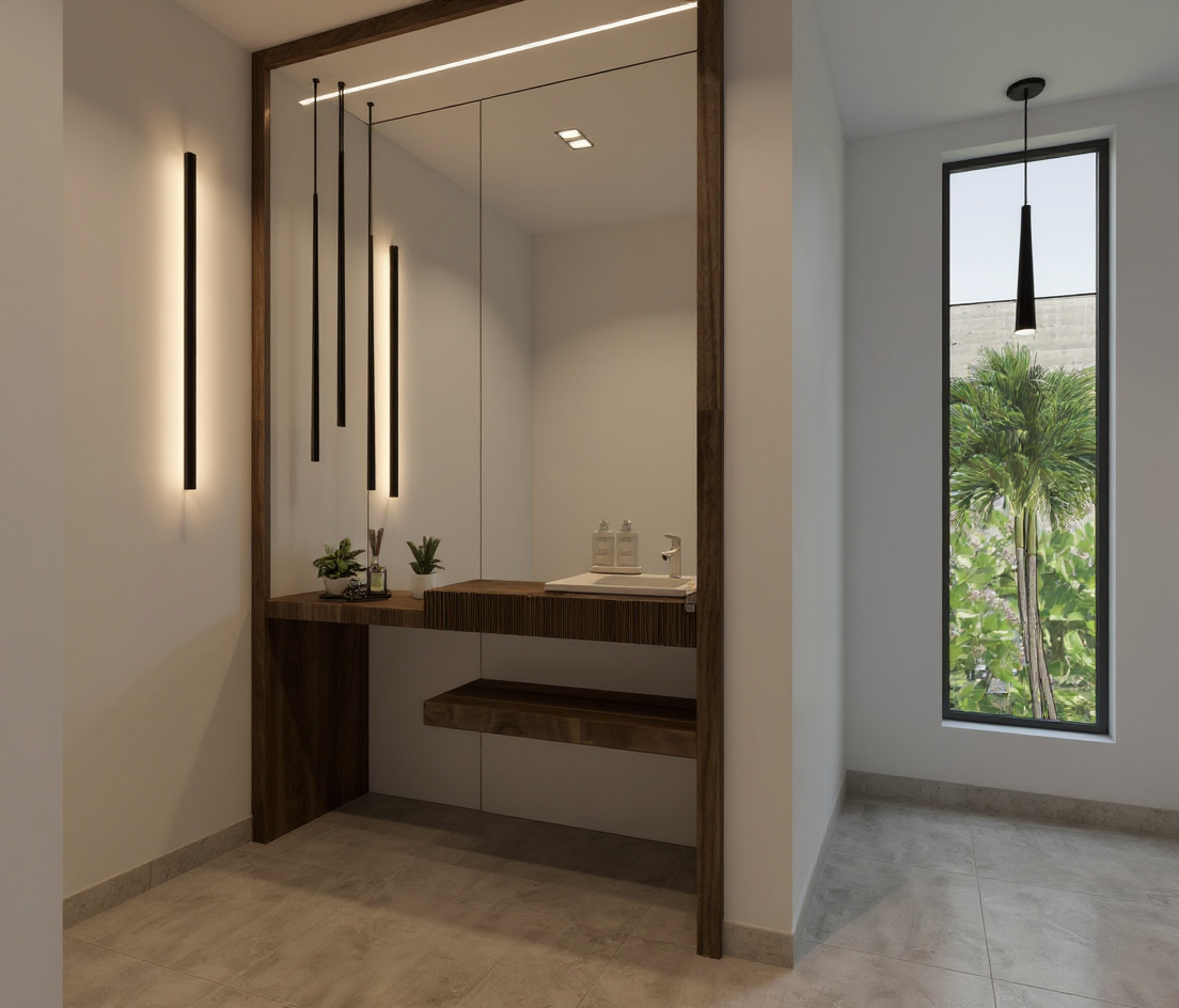 modern luxury house sleek and elegant design use a light gray stucco exterior with some portions a darker gray stucco with soft gray stone accents incorporate black window frames and a black metal roof and soffits add warm wooden elements with a natural cedar finish for the doors and decorative panels the driveway should have a smooth black asphalt texture surround the house with vibrant green grass well manicured and lush add small bushes with white flowers and tall slender dark green juniper skyrocket trees for landscaping set the scene under a clear blue sky evoking a calm and serene atmosphere