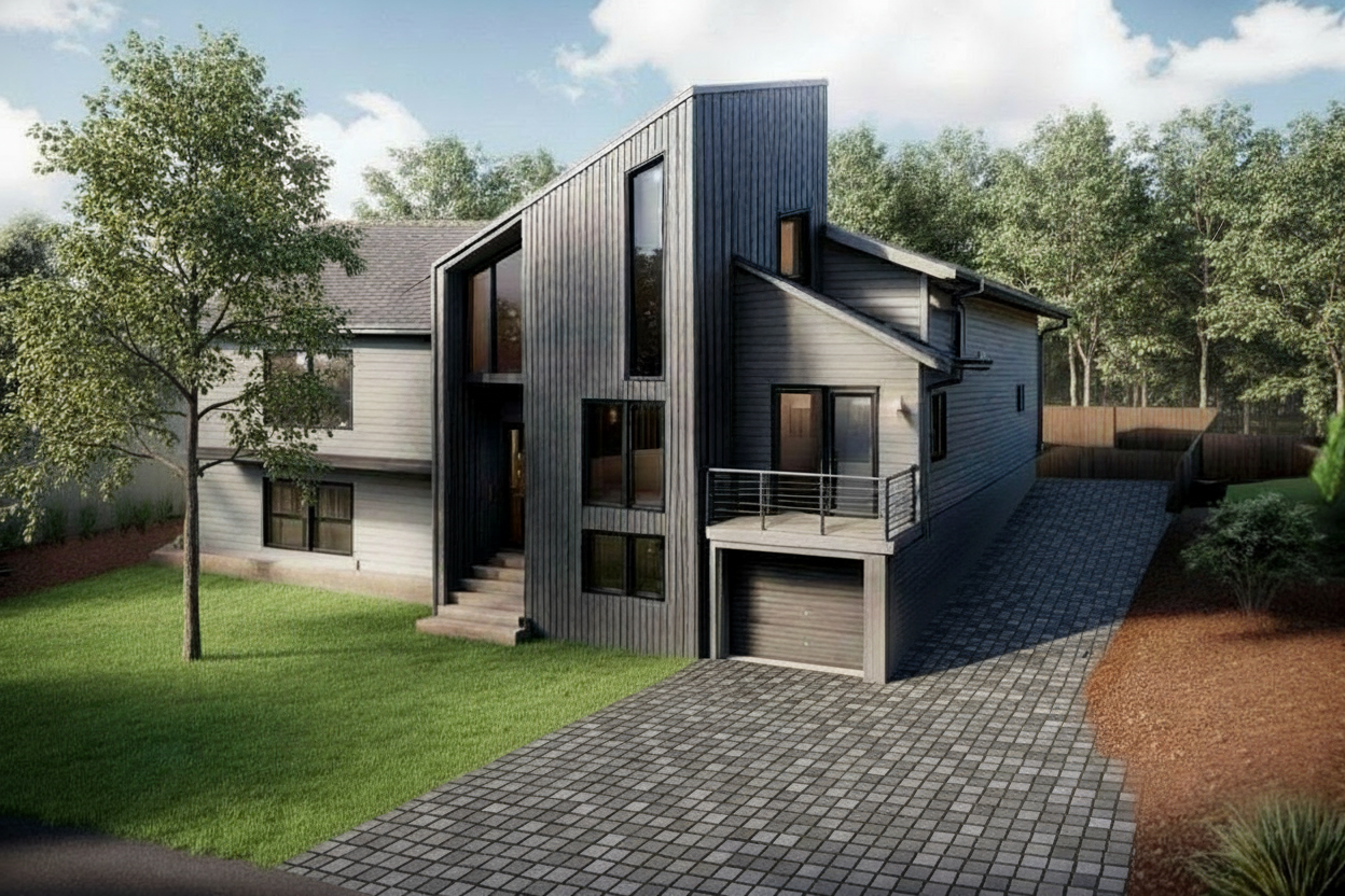 change driveway to light multi tone gray pavers in front of garage door add shrubs in front and curved walkway raise lawn area