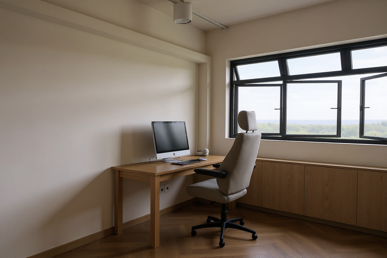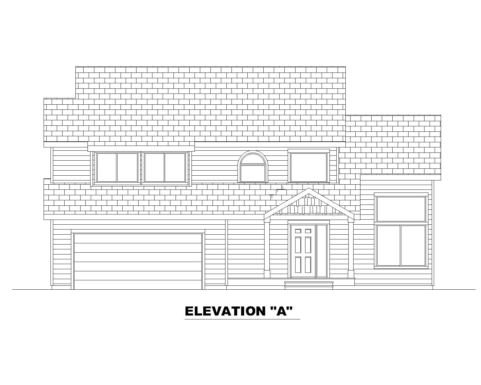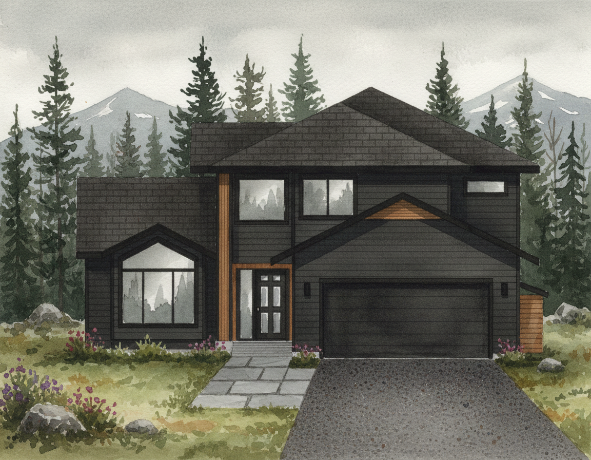 watercolor render of modern home grey house with white trim and brightly colored front door include trees and an alaska like environment in the background simple driveway and walkways in front of the home