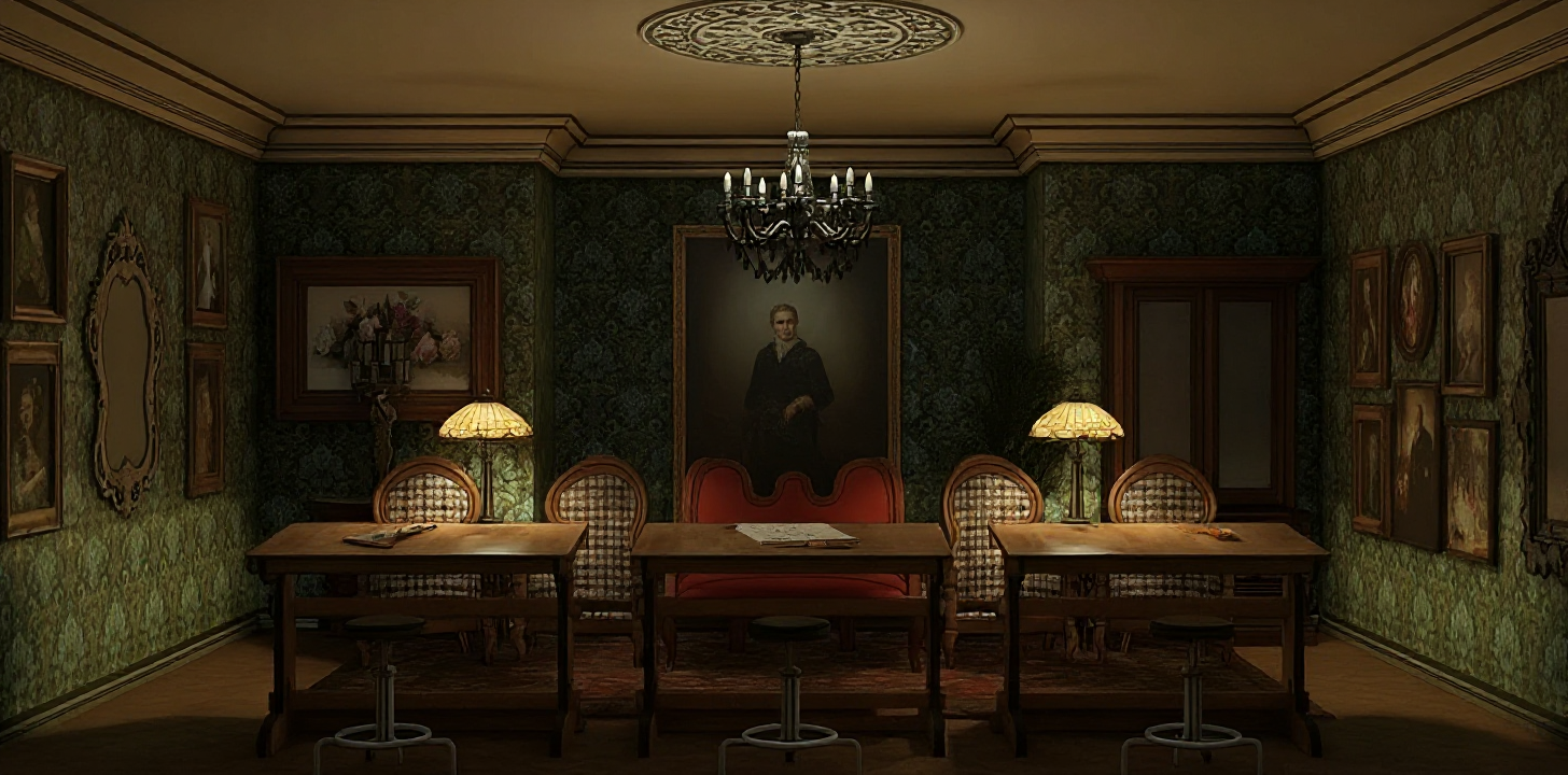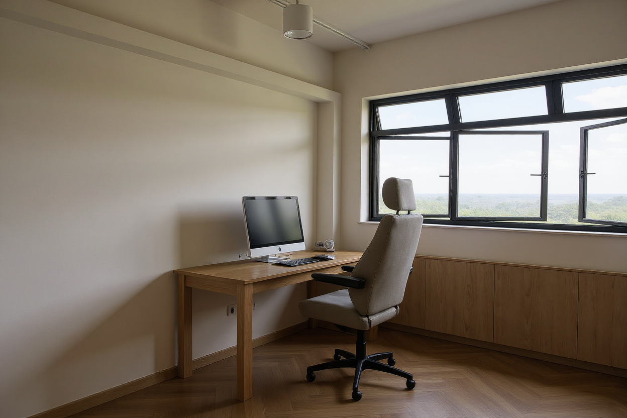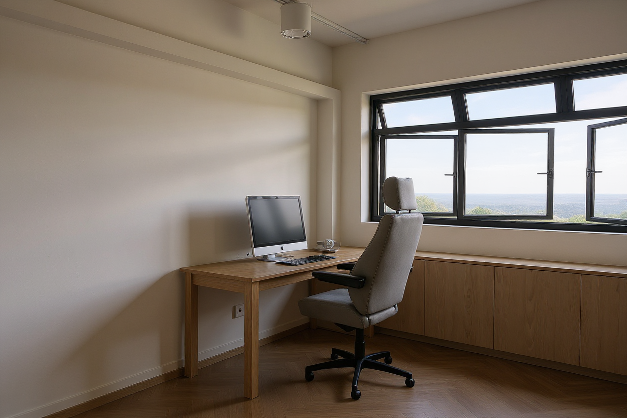 watercolor render of modern home grey house with white trim and brightly colored front door include trees and an alaska like environment in the background simple driveway and walkways in front of the home