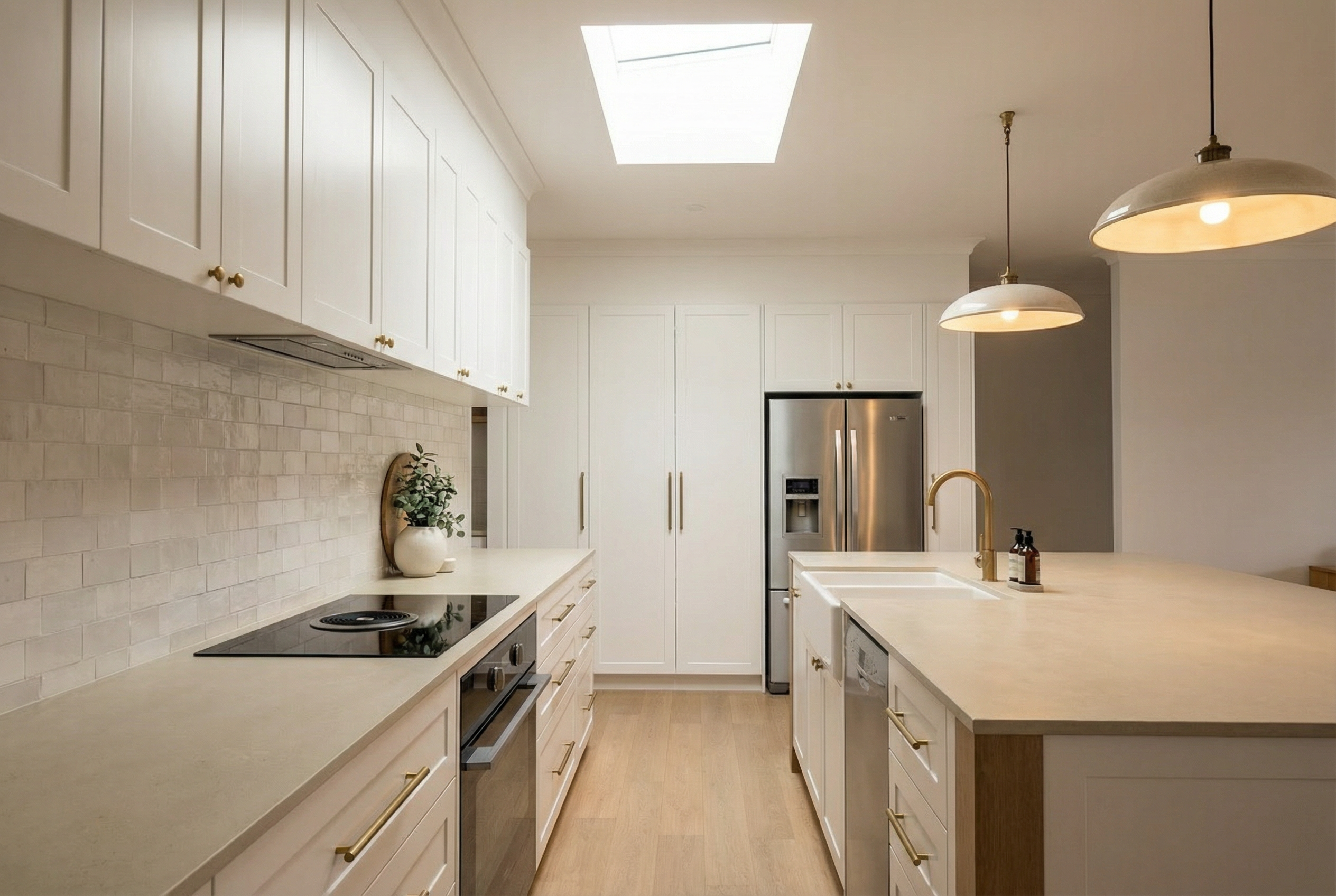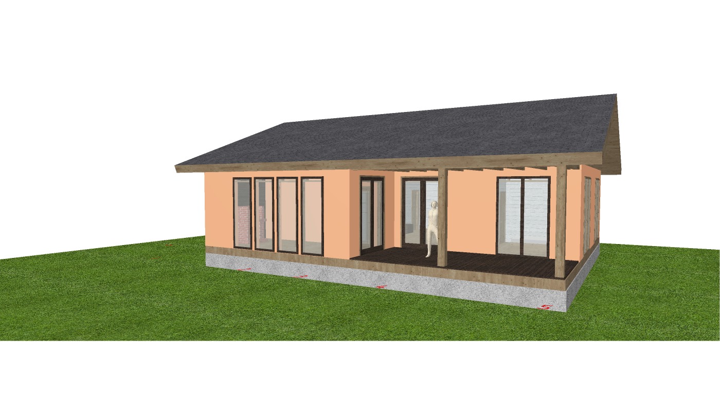 render a modern single story house with a warm peach exterior slate gray roof and expansive glass windows with dark wooden frames the porch and pillars are rustic wood set against a lush green lawn ensure the atmosphere is serene and inviting capturing a sunny day with soft natural lighting that highlights the textures and colors