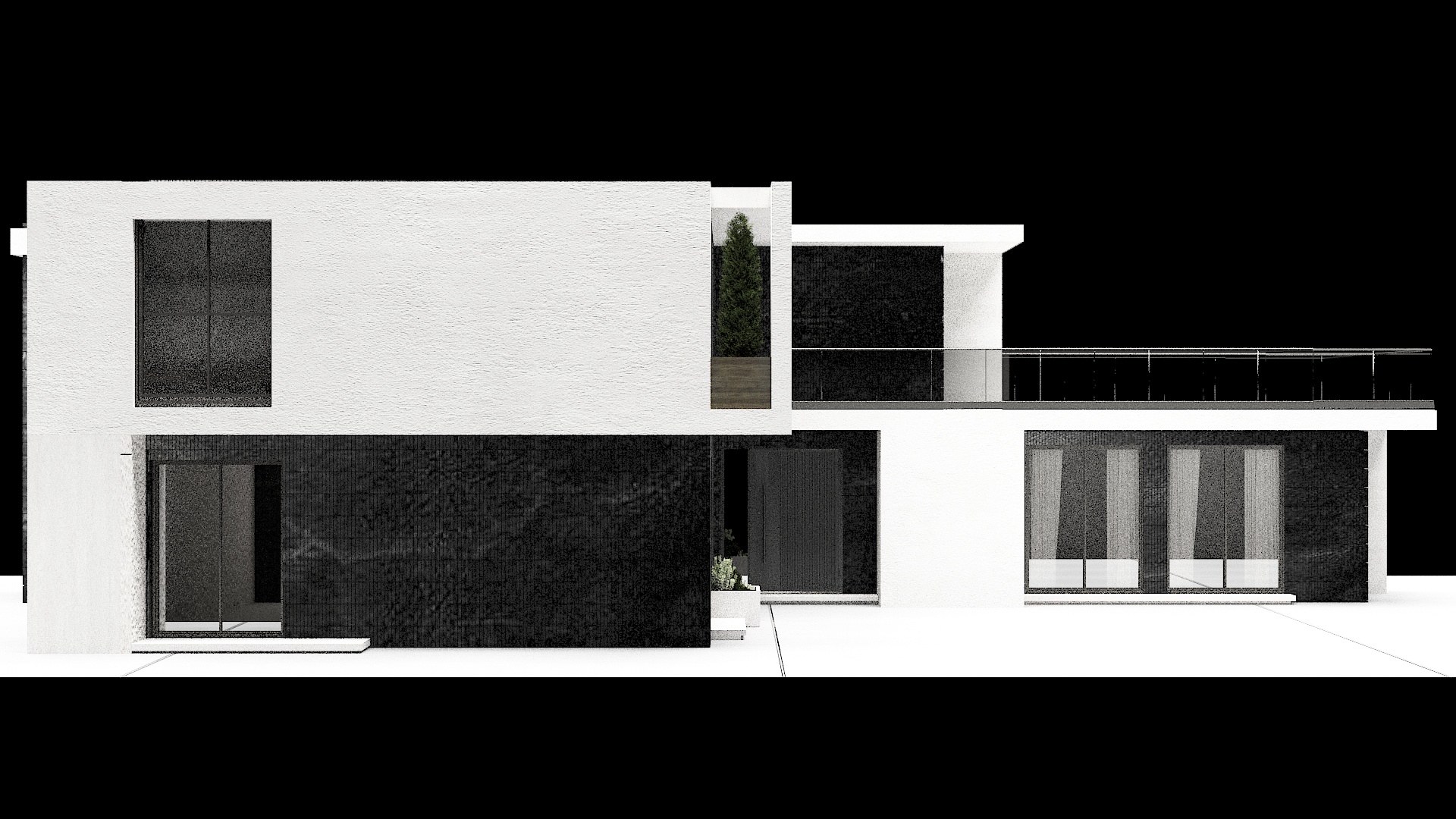 create hyper realistic rendering with exposes concrete in white as well as grey black elements on the facade large glass minimalist windows make plant hyper realistic as well as the grey tilles in the yard golden hour lightening with warm light soft shadows realistic reflections make the background so that the house is located in an isolated wood area do not change any elements in the image do not put new element and do not change colour and material do not add new element