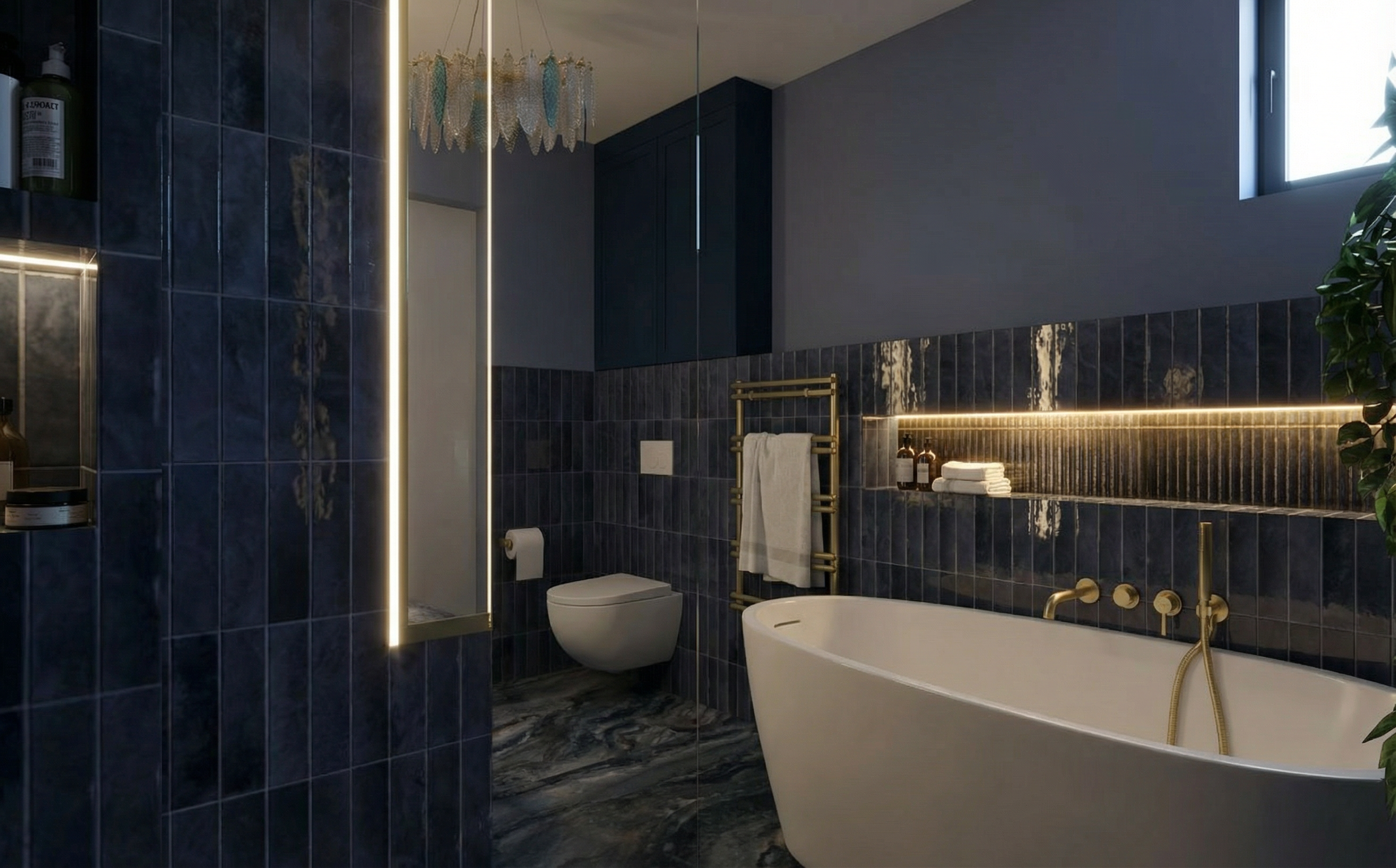 keep all materials and colors the same make this in to a photo realistic rendering put a tree in the window have the vanity lights on