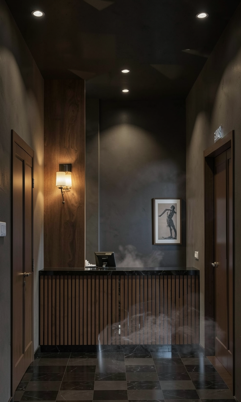 lounge so no windows and darker vibes no people just spaces this is a coat check area with a desk for people to drop off belongings while at the lounge club