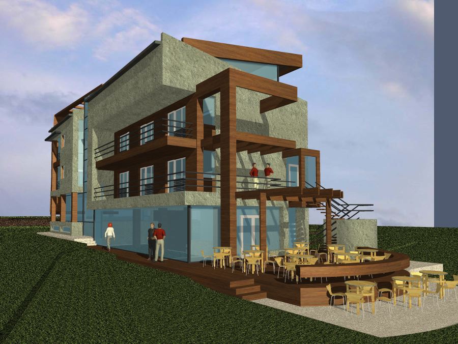 convert the image into a realistic outdoor photograph with professional architectural aesthetic maintaining 100 of the geometry and layout applying authentic materials afternoon warm lighting with soft shadows and a sharp photorealistic result add landscape design behind the building do not change material colors