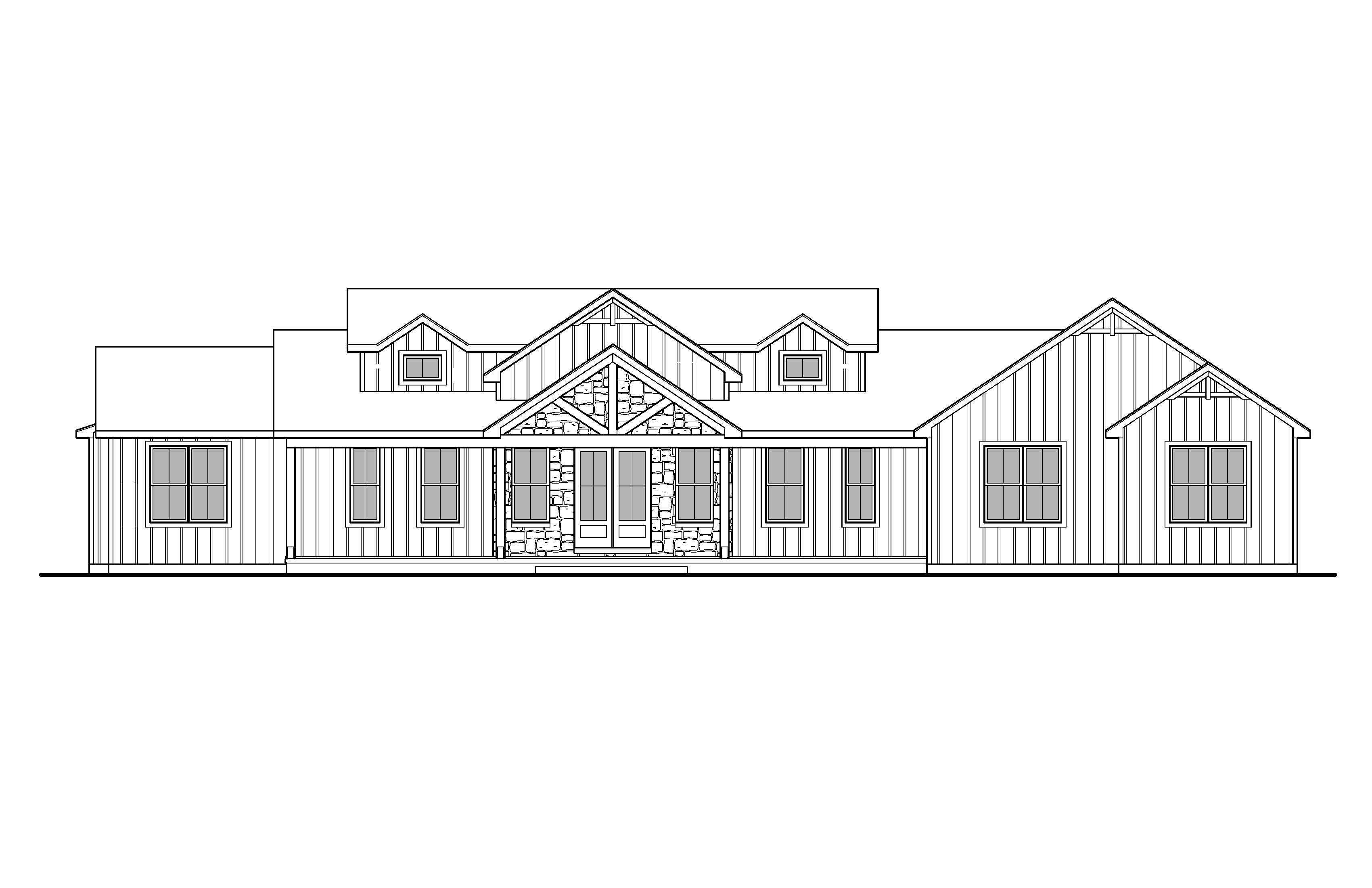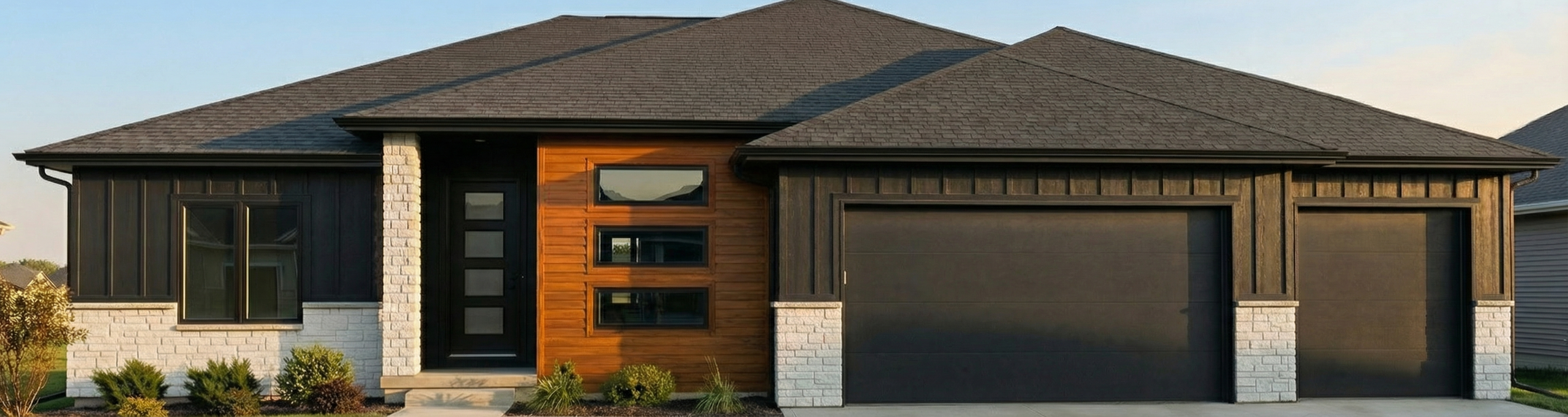 create a three dimensional rendering of this home do not change any material vertical siding shall be beige stone shall be light grey with bronze trim and windows and a medium grey roof with timbers to be a warm wood lush vegetation in the front on a sunny day with trees in the background with reflections in the glass