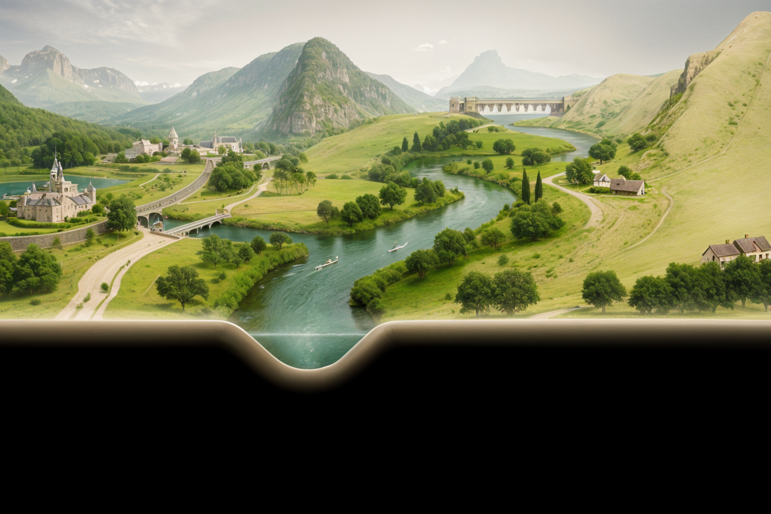 editorial architectural collage of landscape desaturated tones paper texture soft ink edges territorial diagram