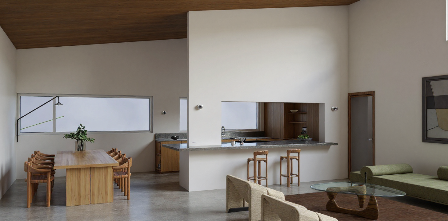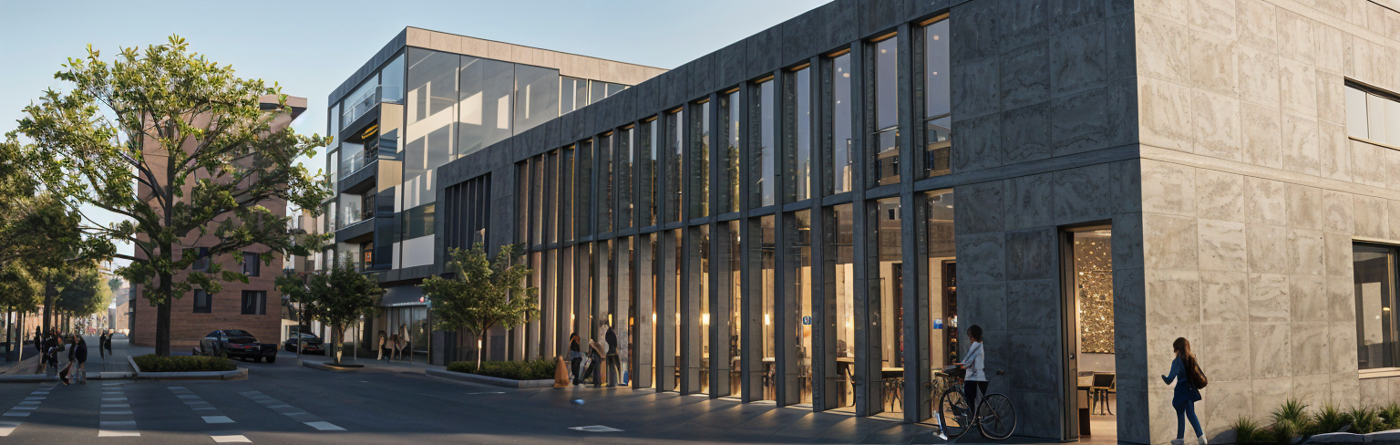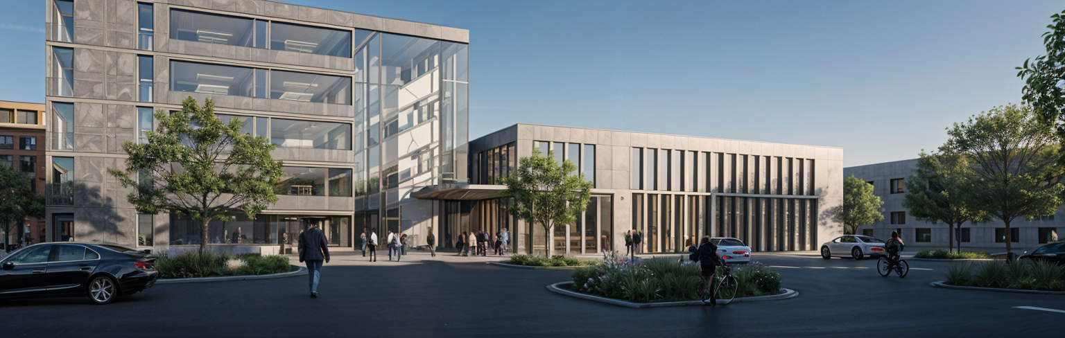 a realistic architectural rendering showing a modern office and workshop complex made of gray exposed concrete with subtle bronze tones and large glass windows the composition presents a low elongated workshop hall connected to an office building on the left at the center of the scene a round white spiral staircase is visible inside a transparent glass foyer standing freely and elegantly within the illuminated entrance area beneath the arcaded zone facing the plaza a caf with outdoor seating adds warmth and liveliness tables and chairs arranged neatly under the sheltered space with a soft interior glow the asphalted plaza includes a few parked cars people walking and cyclists passing through surrounded by small green islands and scattered trees the atmosphere is defined by soft dusk lighting with a warm cinematic evening glow that creates bronze reflections on glass and concrete surfaces subtle interior illumination and long gentle shadows the overall mood feels calm atmospheric and realistic in harmony with the reference image architecture