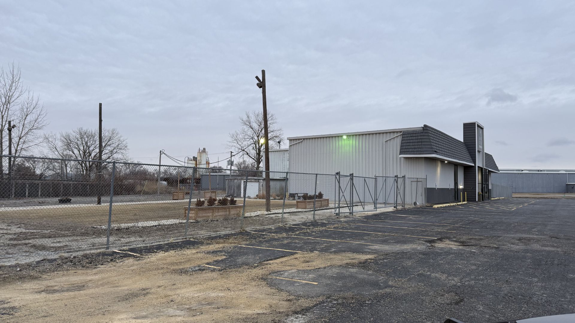 remove fence remove poles repair the asphalt and add a building to left