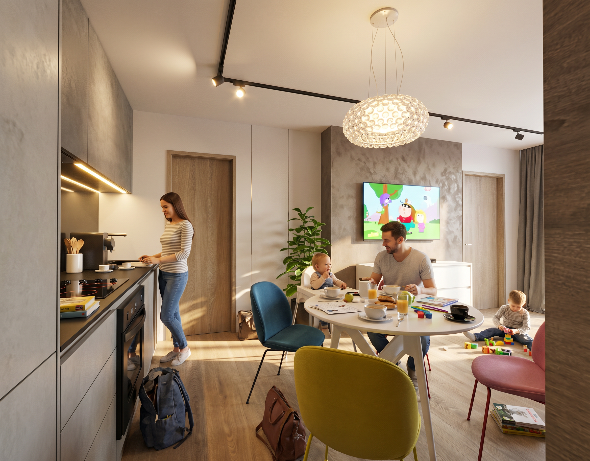 render a modern outdoor patio scene basking in the warm glow of a late afternoon sun the atmosphere is serene and inviting with soft golden sunlight casting gentle shadows across the scene elements architecture sleek white modern buildings with glass features adding a sense of openness walls textured light gray with subtle shadow play fence lush green ivy vibrant and healthy grass well manicured and deep green trees don t change the position of the trees and don t add further trees small mature and leafy providing additional depth with rich green foliage patio bluish gray stone tile flooring cool and elegant furniture natural oak wood table and chairs warm and inviting position of the sun sun high in the sky not low background don t add any buildings