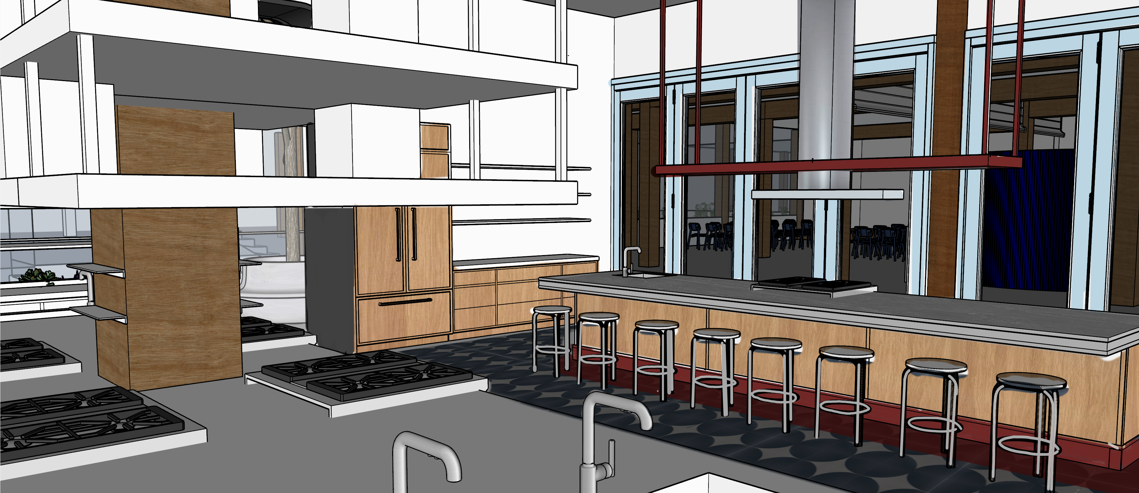 bauhaus interior shot create a photo realistic render of the scene make the hood vent over the island and stools chrome finish daylight comes from the glass beside the fridge and from behind the blue framed glass doors on the right side of the image lights are to be shining down from the hood vent add clusters of pots and pans on the red metal shelves above the hood vent and also hang some below the counter tops are a white marble and the faucets are a chrome the ceiling is exposed so there is mechanical and electrical visible the white suspended shelves surrounding the hood vent should be red metal add spice jars on the small shelves on the left column this is a perspective view architecture