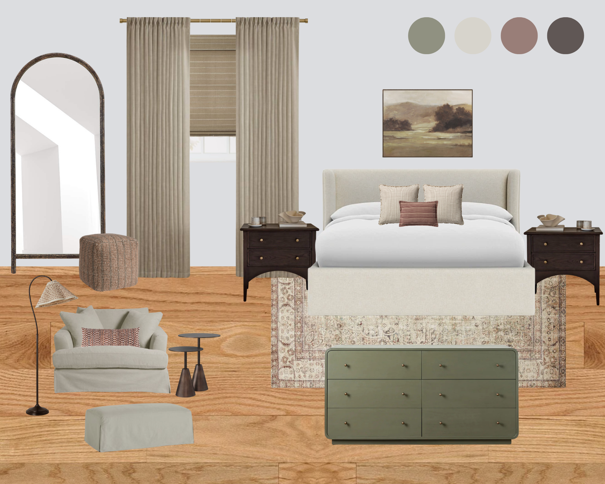 create a serene bedroom scene with a cozy and inviting atmosphere the walls are painted in a soft warm gray the hardwood floor is a light oak color place an upholstered beige bed with white bedding and accent pillows in neutral tones with hints of soft green and dusty rose add two dark wood nightstands with matching lamps on either side of the bed in the corner position an oversized mirror with a dark metallic frame include taupe curtains framing a window allowing natural light to filter in softly a rustic landscape painting is centered above the bed in earthy tones of green and brown in the corner add a cozy armchair in a soft grayish green fabric with a matching ottoman accompanied by a small modern black side table place a floor lamp with a woven rattan shade nearby include a textured pouf in a natural brown color the atmosphere is calming and restful with subtle earthy tones throughout
