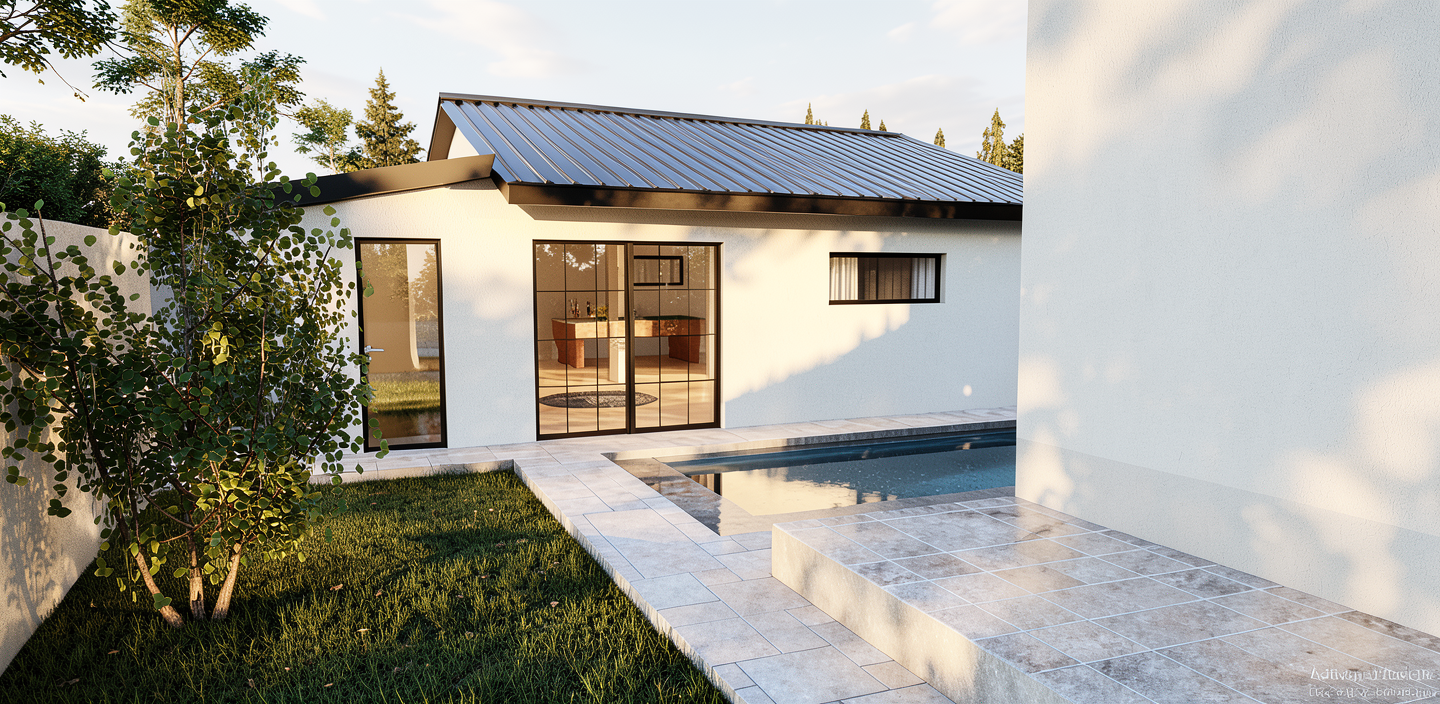 add very few trees and vegetation in to give context add creamish white interior warm lighting
