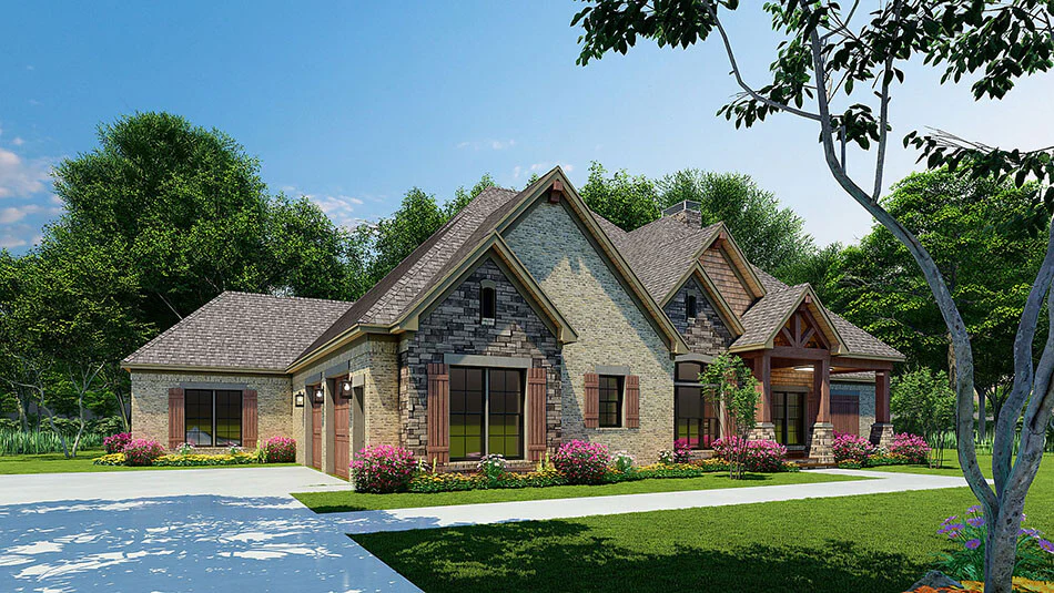 create high resolution real vibrant photo with plush trees and bushes with vibrant blue sky keep all details exact as original create a fresh spring settings green grass a country french theme country french blue shutters with off white brick stone