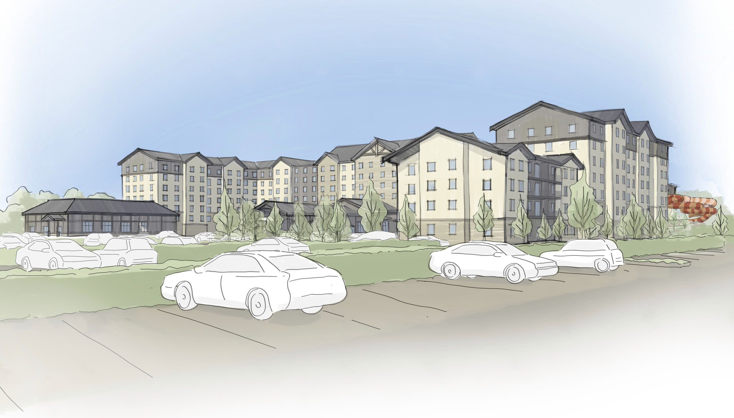 roofs and recessed bays to be greeen oxide plint to be rough stone main parts of facade to be more saturated and richer colours architecture