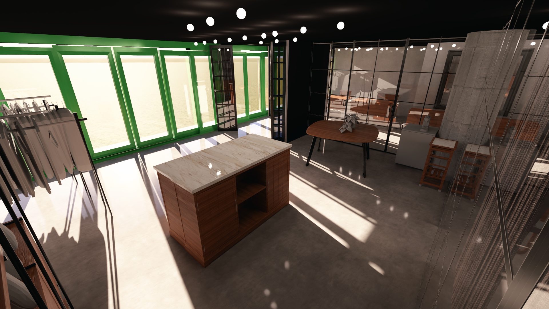 seamstress workshop grey floor concrete walls and columns black framed glass doors light up interior add floor lamps with cloth white shades