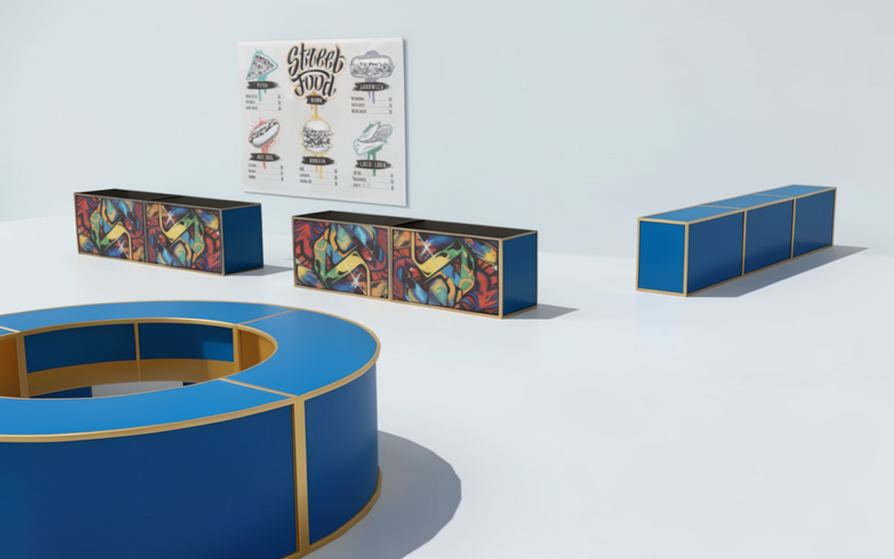 add a small retail vignette under the green ceiling clouds do not change any design elements of the original image