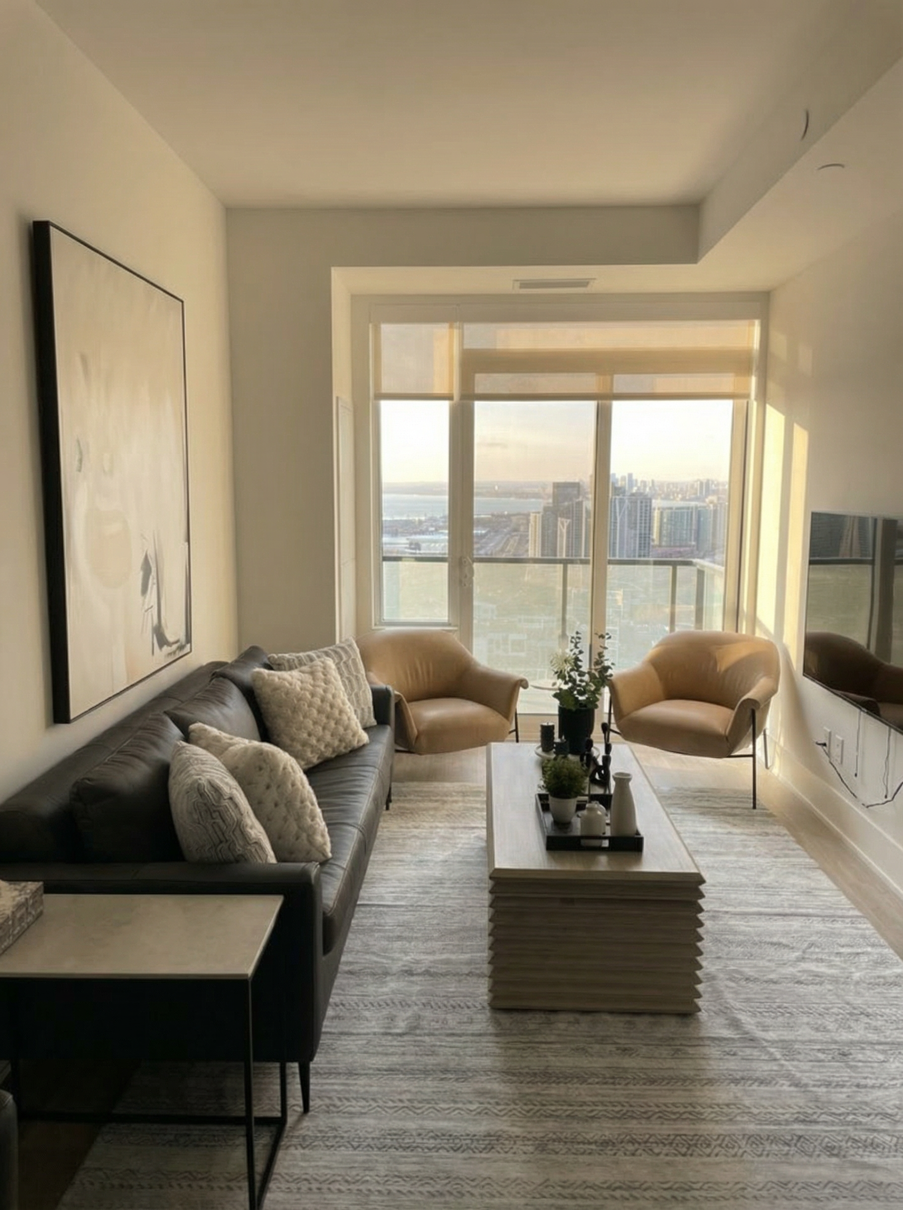 wooded site grassy foreground dusk warm interior light