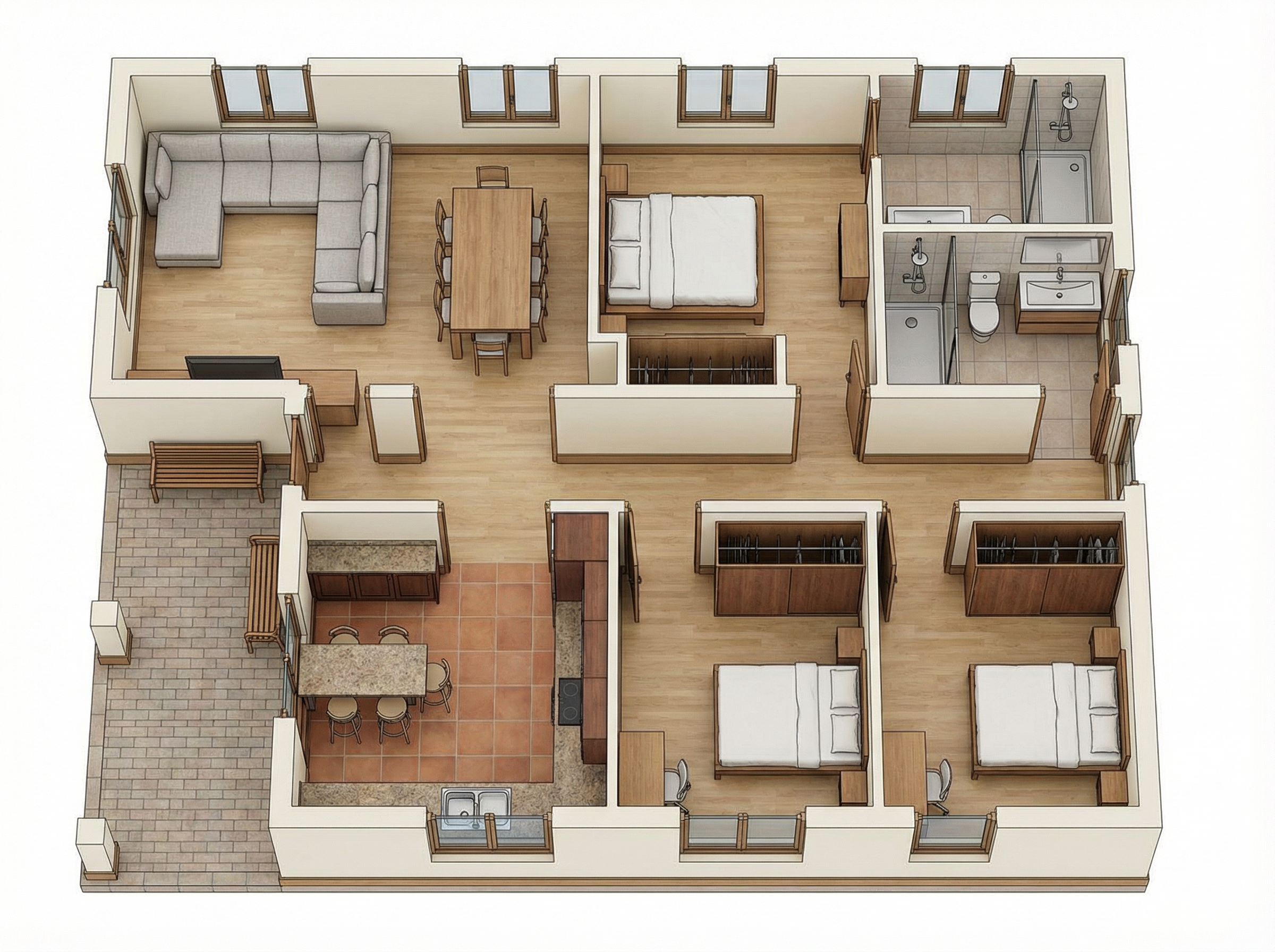 use the uploaded image as the base reference transform this space into a lived in contemporary office while strictly preserving the existing architecture proportions materials and lighting add a small group of people 5 8 maximum working naturally in the space architects and designers at desks people discussing around a table one or two people walking or standing relaxed natural postures candid moments no posing the people must feel realistic discreet and integrated with neutral elegant clothing beige white grey soft black tones no exaggerated gestures no smiles toward the camera no stock photo look maintain a calm high end architectural atmosphere soft natural daylight balanced exposure realistic shadows and reflections subtle depth of field the office should feel active but serene professional creative and credible the focus must remain on the architecture with people enhancing the sense of scale and life not dominating the scene ultra realistic photographic quality architectural visualization level no distortion no warped geometry no changes to the base image structure