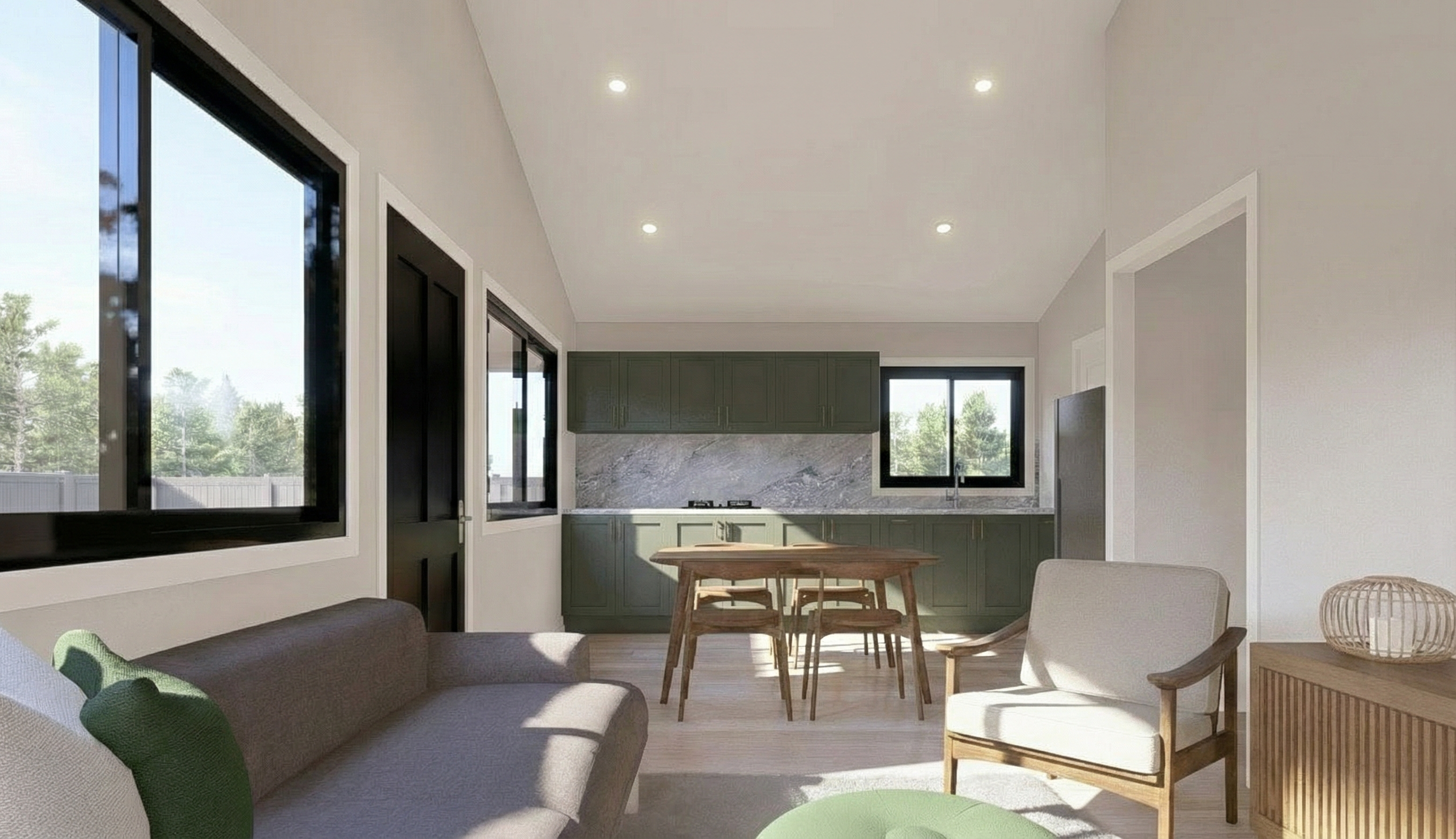 modern living room interior bright and airy atmosphere sunlight streaming through large windows walls painted in soft white providing a clean backdrop a sleek stainless steel refrigerator reflects light creating a modern vibe the room s centerpiece is a warm wooden dining table with matching chairs adding a cozy and inviting feel a gray upholstered sofa with subtle texture sits comfortably accented by green throw pillows the floor is light oak enhancing the room s warm ambiance outside a lush green garden is visible framed by black window borders bringing nature indoors
