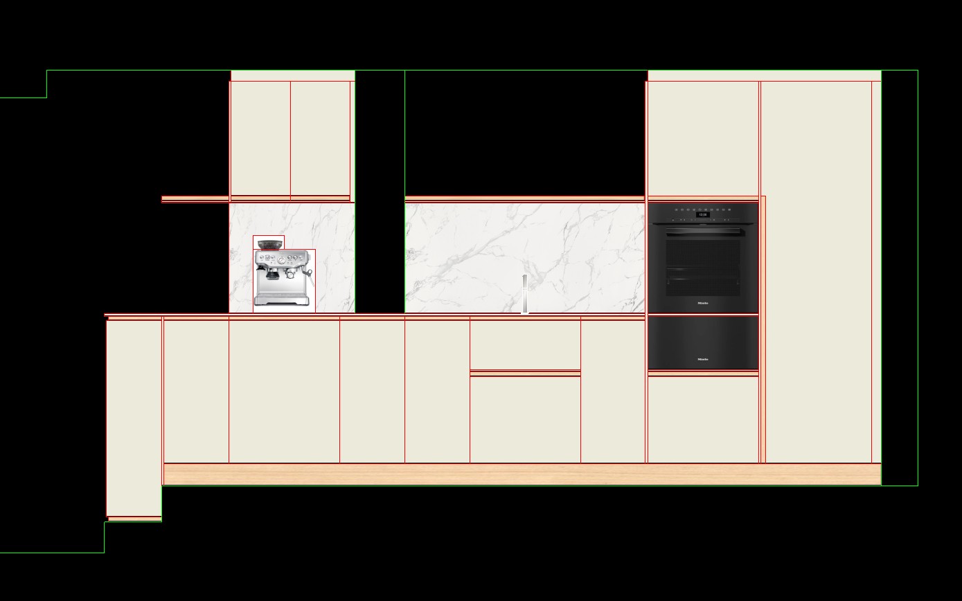 create a photo realistic render from this kitchen elevation add lighting to the underside of the shelfs and wall cupboard keep the same finishes as on the elevation