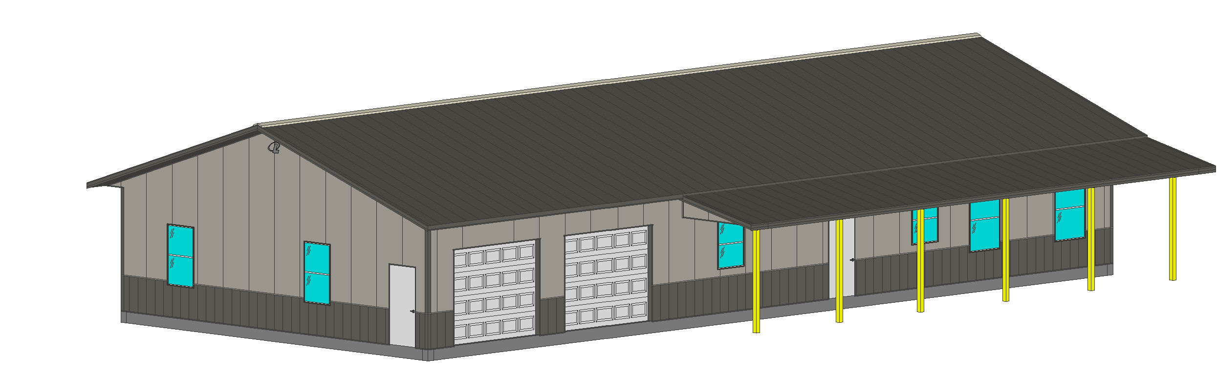 a modern rustic building with a dark gray roof light gray walls and dark trim the building features bright turquoise windows and bold yellow support poles the garage doors are a light gray with a geometric pattern create a serene and peaceful atmosphere with soft natural lighting and a clear blue sky