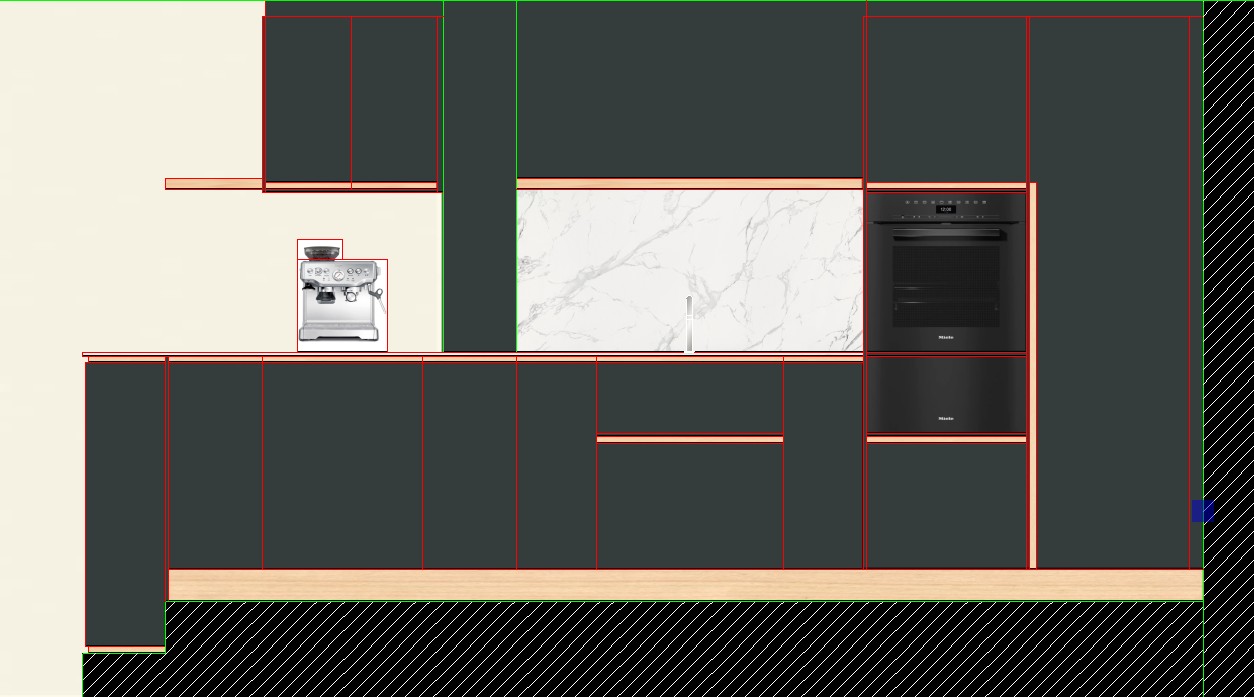 generate a photo realistic render using this elevation keep all materials and finishes the same the green paint is studio green by farrow and ball wooden elements are lime washed oak add lighting to the bottom of the shelf and wall cupboards