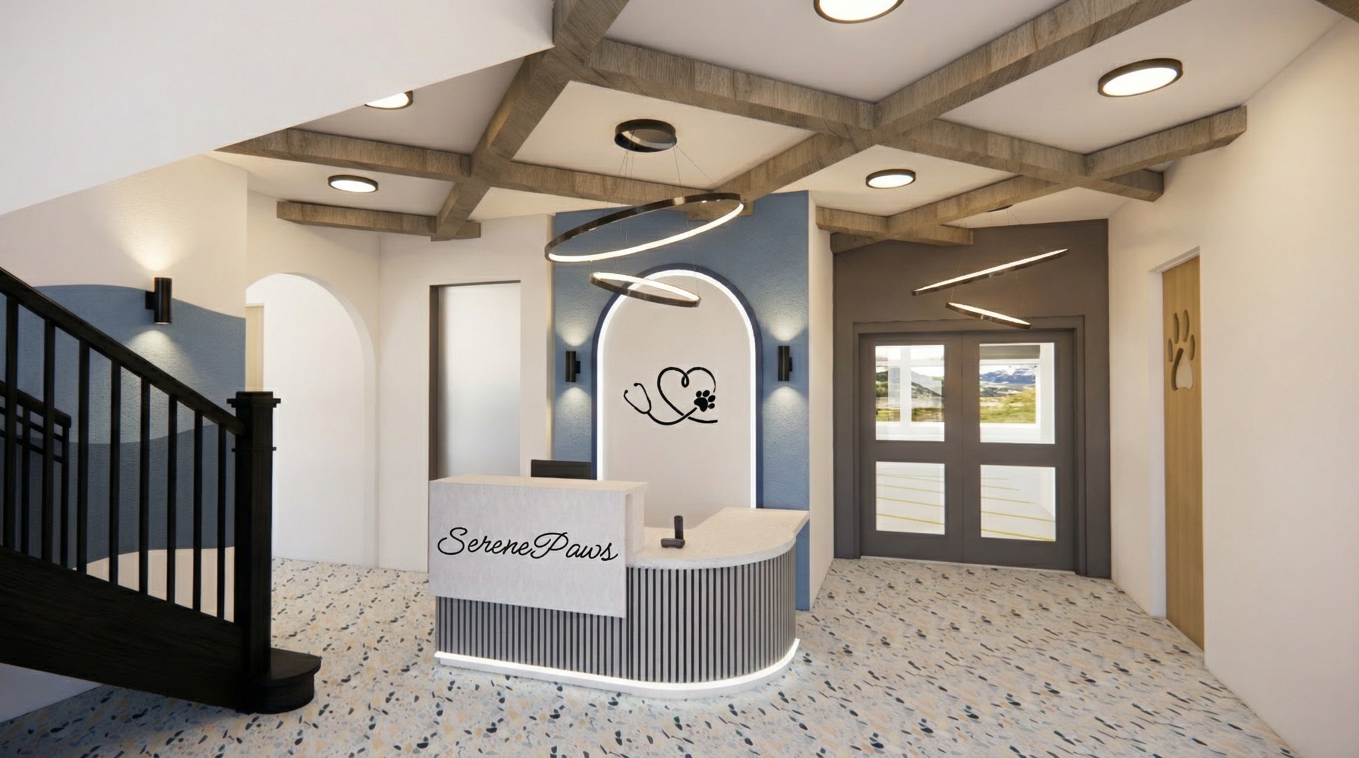add a curved signed over the arch opening on the left side that says canine waiting room and make the ceiling light fixtures fully recessed keep everything else the same
