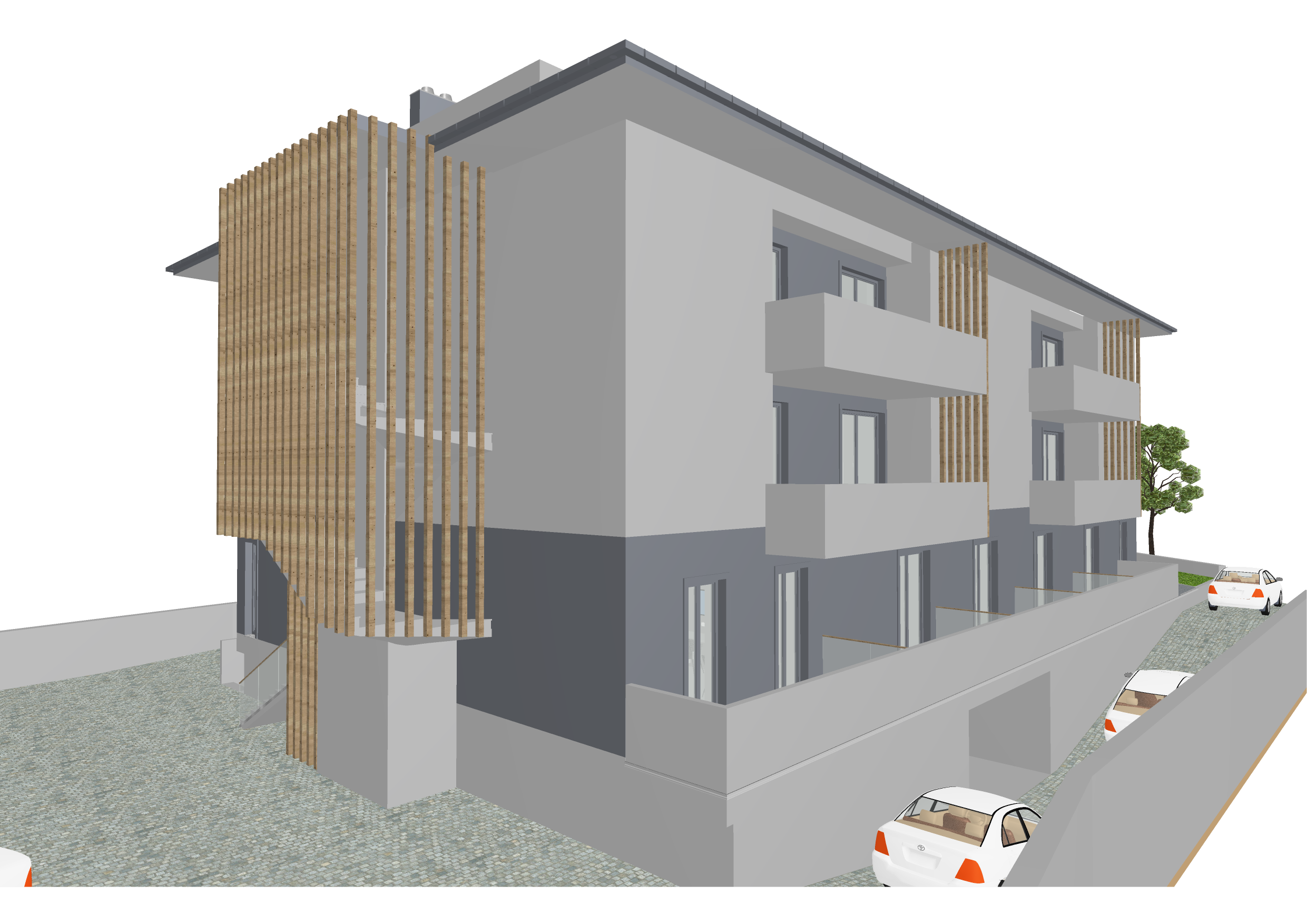 exterior shot a modern architectural building with a sleek contemporary design featuring light gray stone walls and expansive glass windows the building s structure is accented with subtle dark gray trims and a flat roof complemented by a luxurious entrance soft warm lighting emanates from inside creating a welcoming atmosphere in front a clean white sedan is parked on a cobblestone driveway surrounding the building are neatly manicured green grass and small trees with vivid green leaves under a clear blue sky balconies at the ground floor are like the others of the first and second floor without glasses architecture