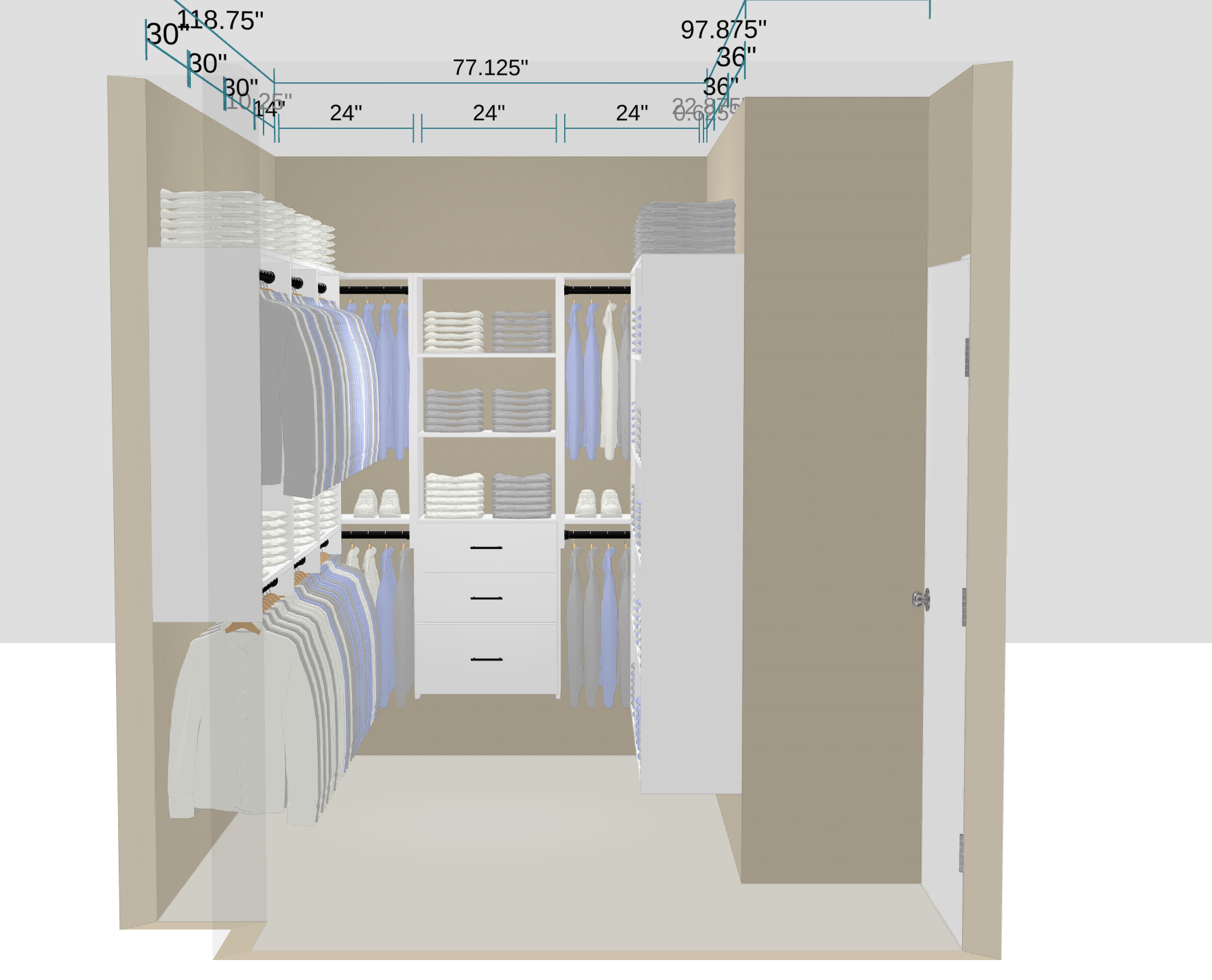 render a luxurious walk in closet with a calming atmosphere the closet features rich cream colored walls and crisp white shelving include neatly organized clothing in soft blues whites and blacks the closet has wooden hangers for a touch of elegance add folded clothes in a gentle lavender color on the shelves shoes are displayed in pristine white the room is softly lit with warm lighting to enhance the cozy and sophisticated ambiance the camera angle is looking through the wall