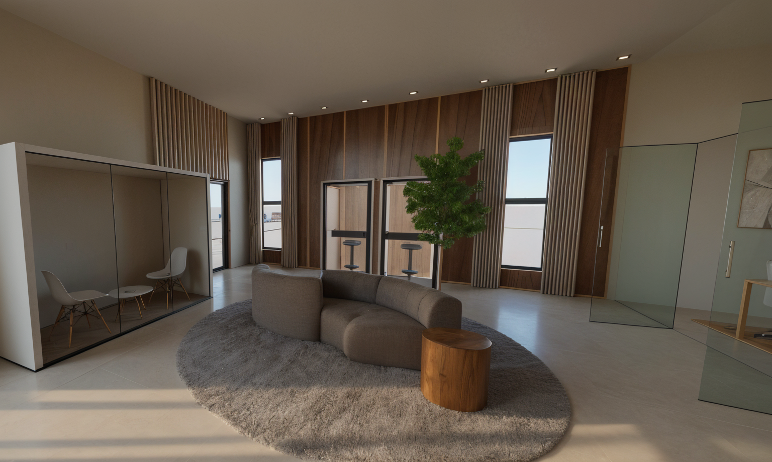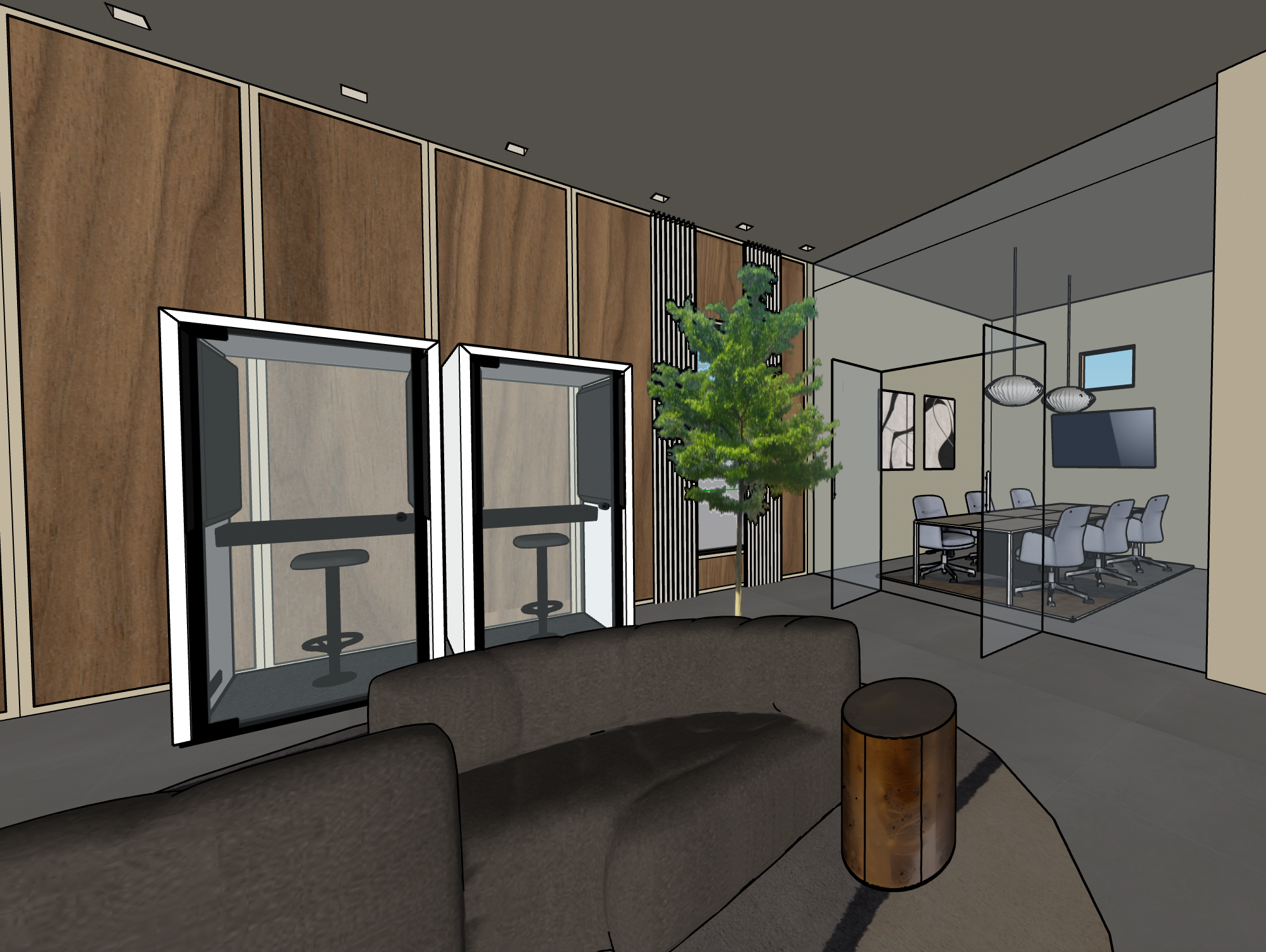make the office chairs a steel blue color the sofa a deep lush brown and the rug in the conference room a beige plaid