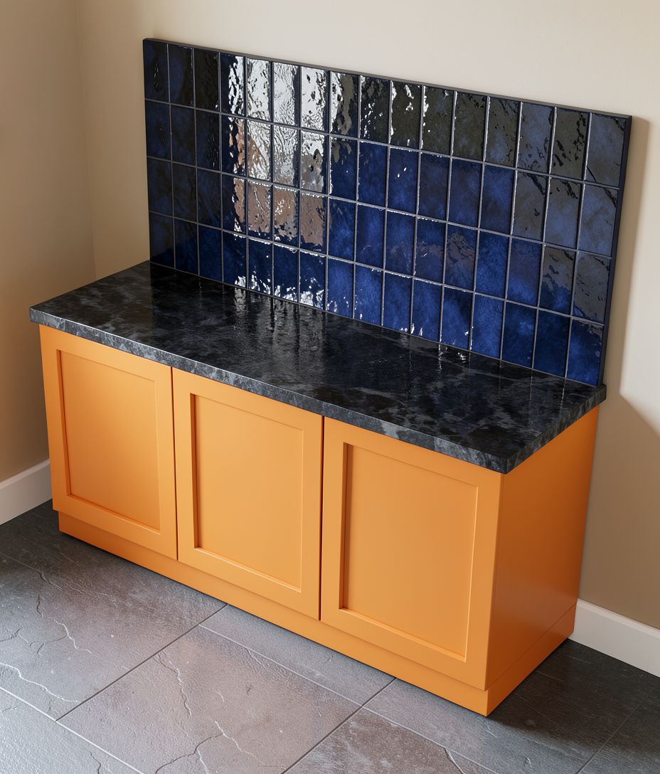wall materials critical must match references exactly back wall split horizontal design key feature upper half apply white square beveled tiles with pillowed 3d effect small tiles arranged in precise grid pattern each with raised cushioned center and beveled edges creating quilted appearance rendered in white with subtle shadows emphasizing dimensional relief structure extending from mid wall height to ceiling lower half apply horizontal linear wave texture in white fine parallel grooves running horizontally across ceramic tiles creating subtle rippled striations with matte finish extending from floor to approximately countertop height behind vanity critical detail sharp horizontal dividing line clearly separates the two texture zones at mid wall height left wall rectangular white tiles with white heated towel radiator featuring horizontal ladder design mounted centrally providing clean contrast to the textured back wall right wall smooth white painted surface continuing the minimal monochromatic aesthetic key layout elements central vanity configuration wall mounted floating vanity cabinet in natural light wood finish oak tone featuring two large handleless drawers with clean horizontal reveal line between them wood grain texture clearly visible with vertical orientation providing essential warm accent against cool gray palette white countertop surface supporting rectangular white vessel sink with soft rounded corners positioned centrally modern chrome single lever faucet with vertical mounting extending from countertop behind sink mirror and accessories large circular mirror with thin wooden frame mounted on upper pillowed tile section centered above sink mirror reflection rendered as simple gray gradient following technical drawing conventions discreet warm light comnig flom behind the mirror